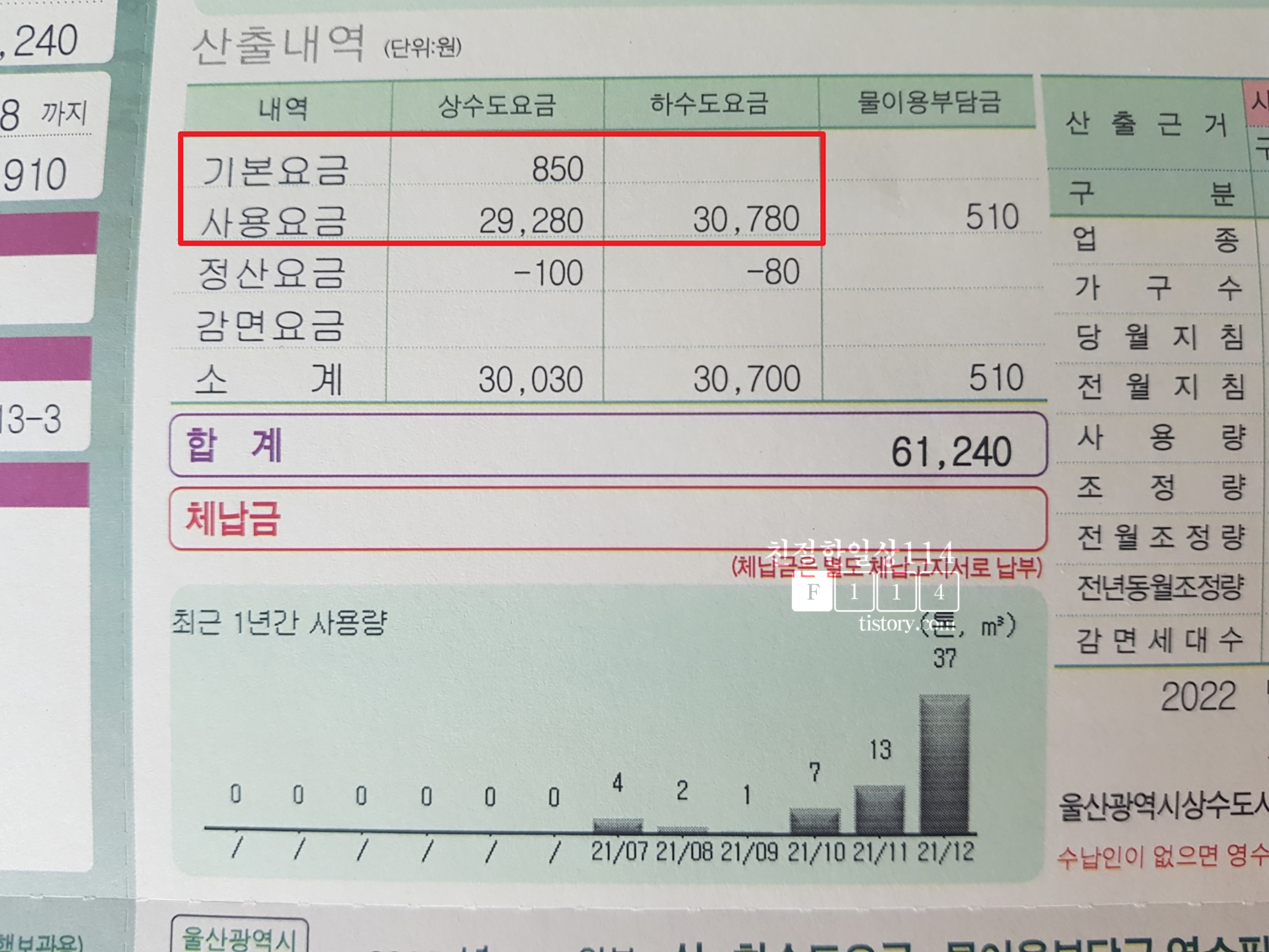 첫달 1만원도 안되었던 수도요금이(첫달에는 입주전이라 사용량이 거의 없었다.) 2번째달 1만 7천원 (이사 후 6일정도 사용한 요금), 한달 풀로 사용한 세번째 달에는 6만5천원 가량 나왔다. 수도요금이 심상치 않아서 고지서를 자세히 들여다보고 계산해보기 시작했다.