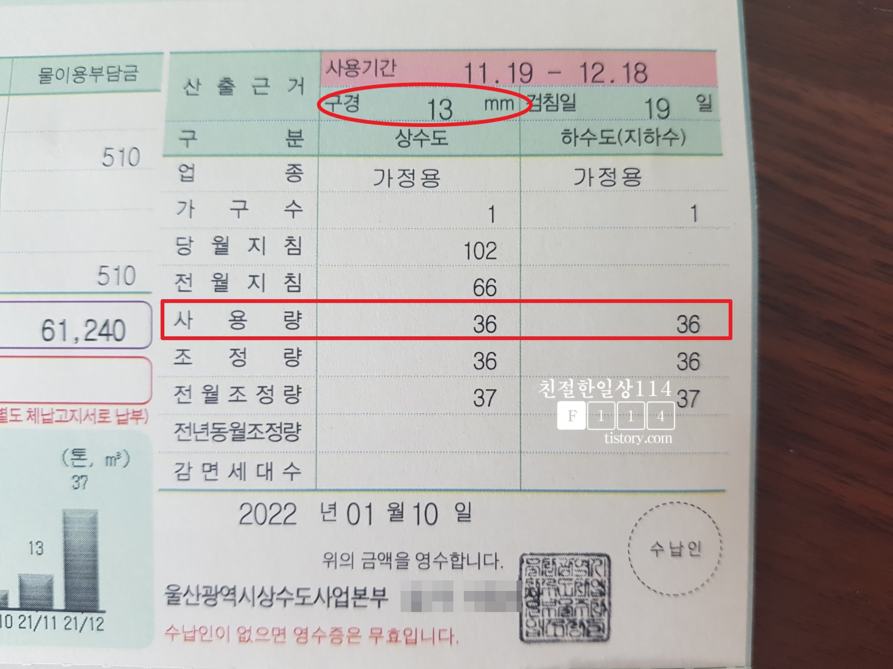 이번달에 납부할 요금의 기준인 지난달 물 사용량을 보면 36톤(m2)이다. 그리고 수도요금 제일 위에 있는 기본요금이 있는데 이는 상하수도 공사당시 매립한 관의 지름에 따라 부과가 된다. 우리집은 13mm 로 매립을 했기에 13mm의 기본요금이 부과되게 된다. 이제 사용량을 봤으니 뒷장을 넘겨본다.