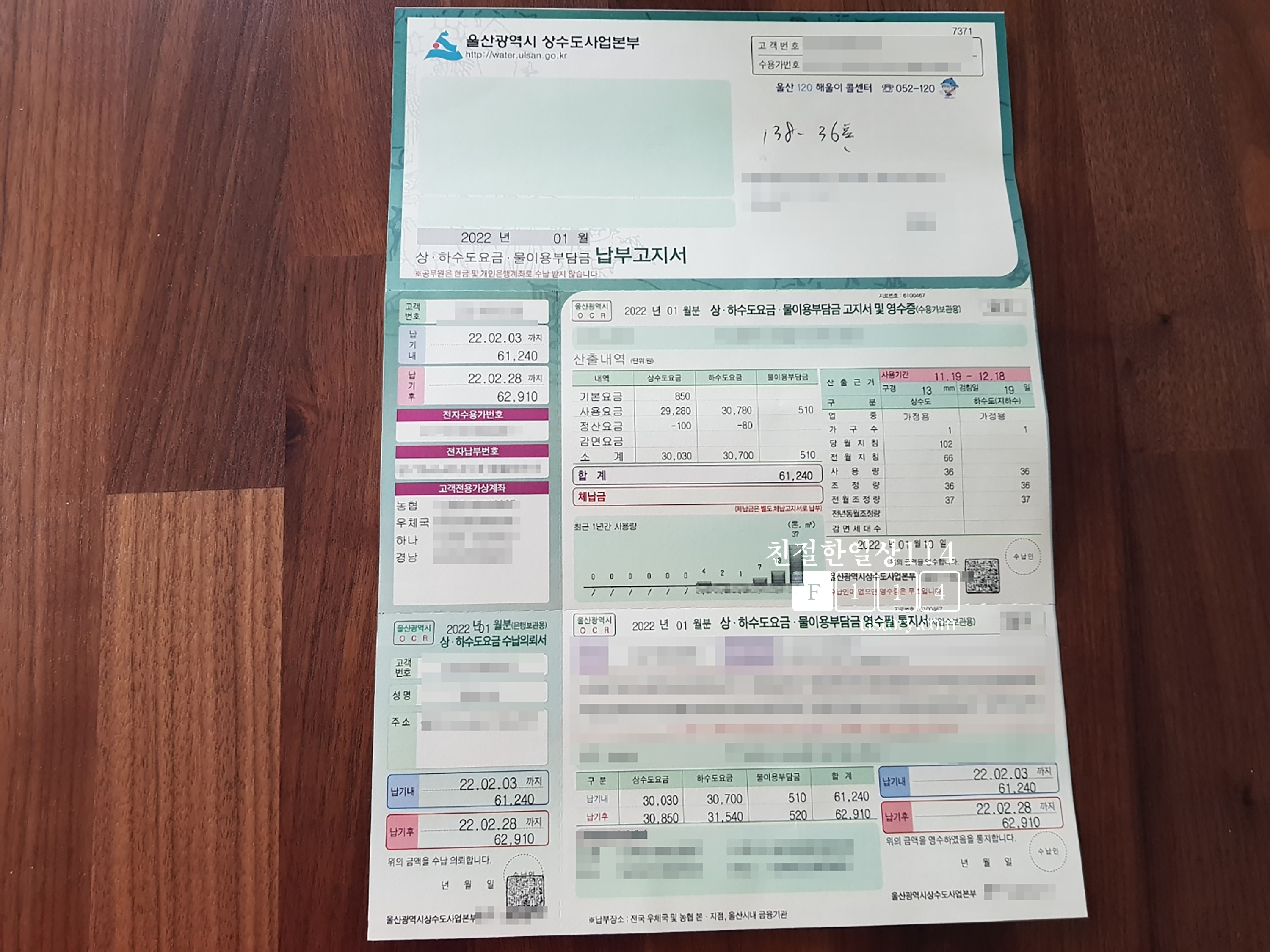 이렇게 계산한 36톤에 대한 상수도 요금은 29,280원 / 하수도 요금은 60,606원 이다. 아래 납부고지서상의 요금과 대조해보니 요금이 맞아 떨어진다.