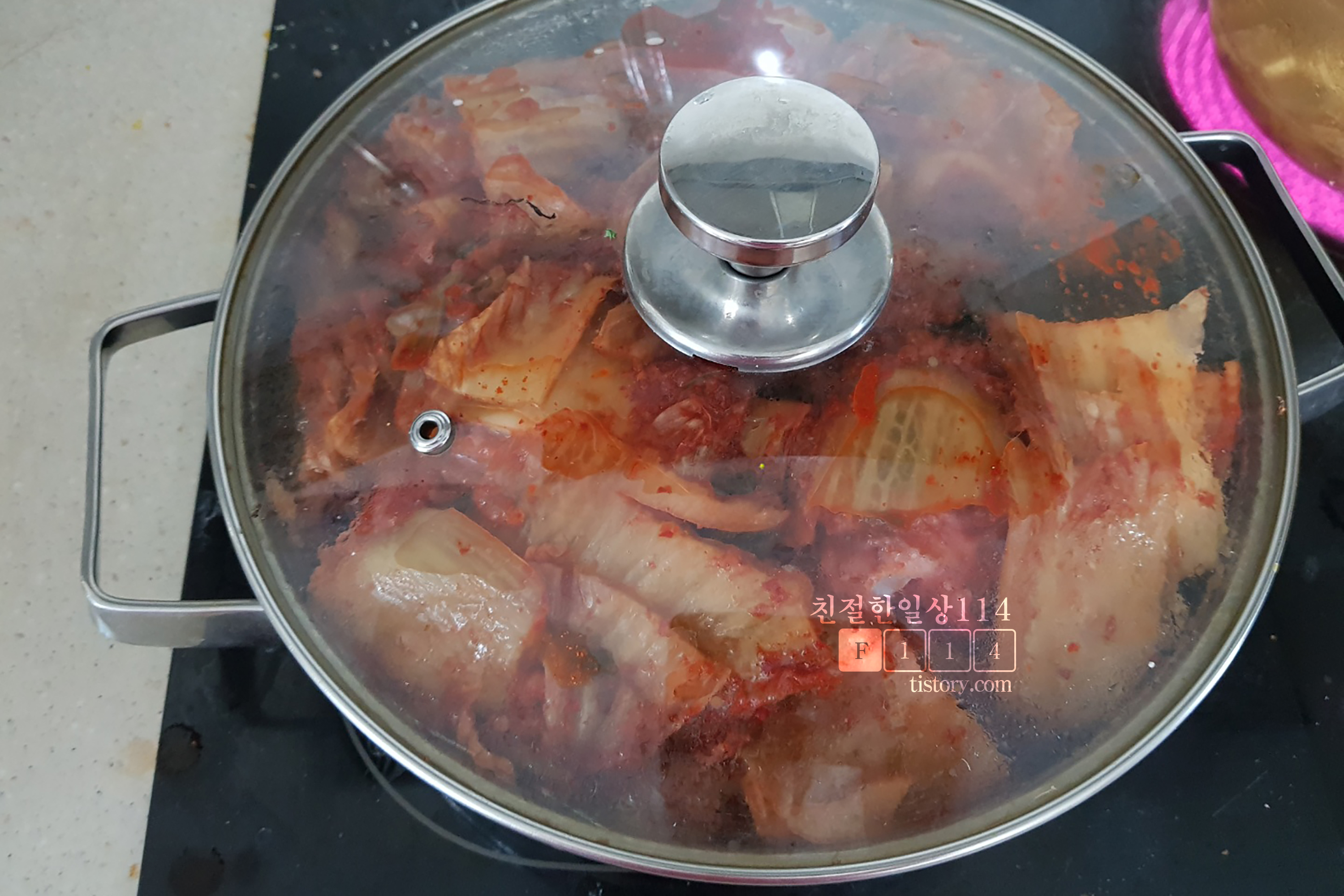 *푹 익힌 김치를 원한다면 20분정도 더 익히면 되며 얼큰한 맛을 원한다면 고추장과 고춧가루를 넣어가며 맵기를 조절한다.