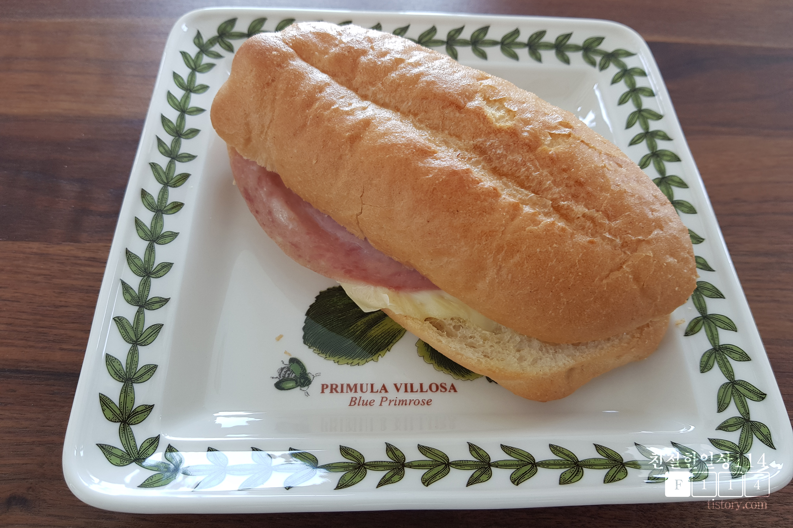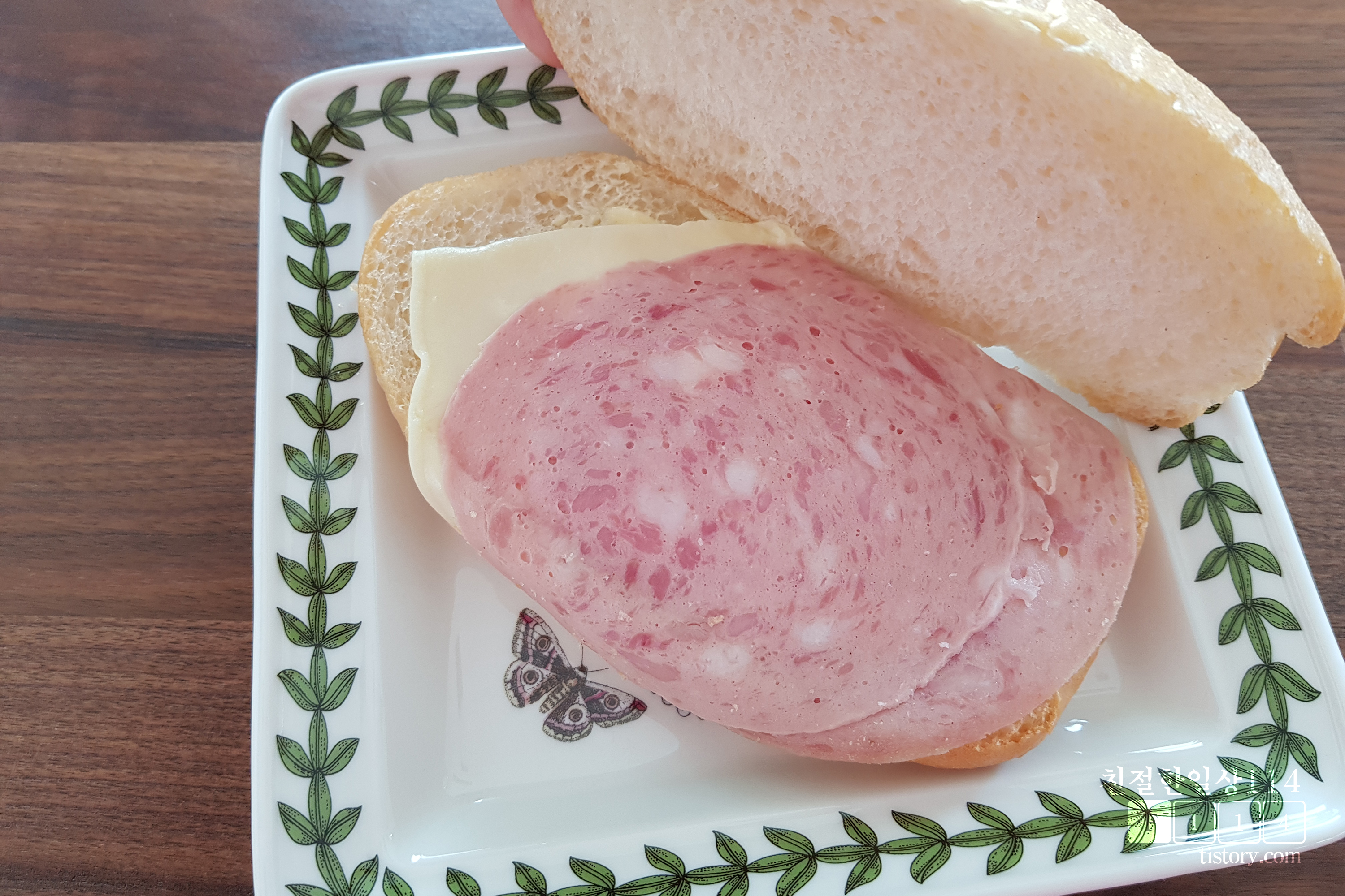 자연해동 후 포장지를 벗겨 접시에 담는다. 뚜껑빵을 열어보니 들어간 재료가 보인다. 치즈와 햄2장 뿐.