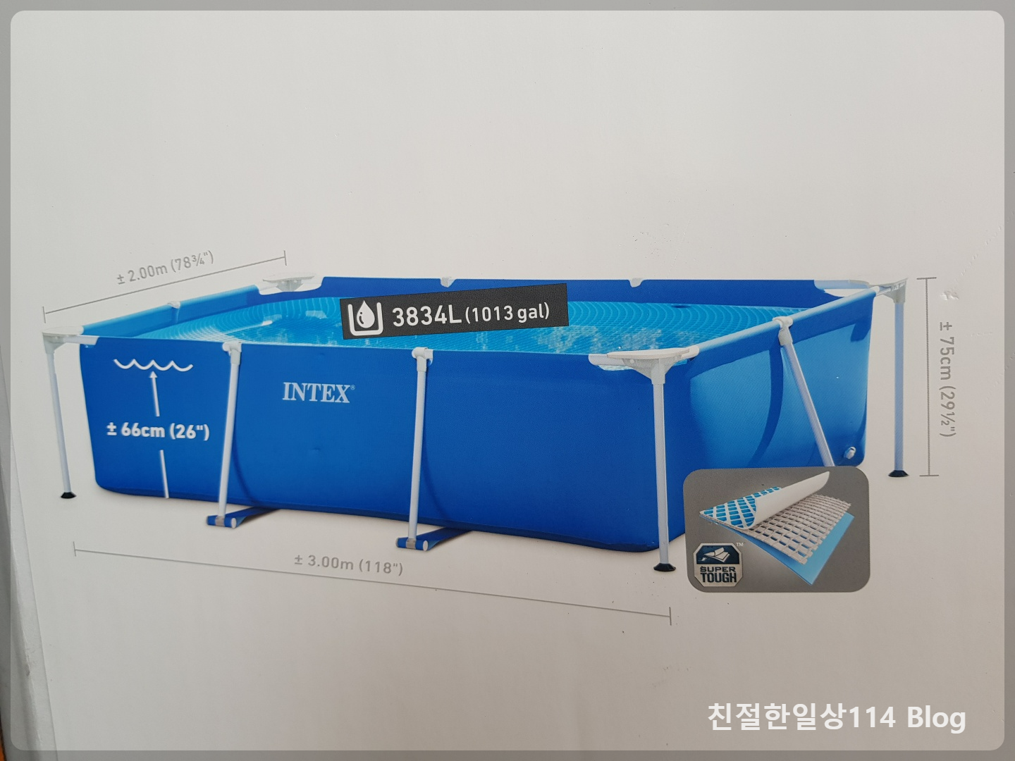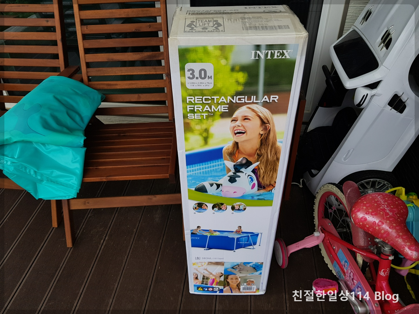 이번에 구입한 인텍스 수영장은 대형 사이즈로 3m x 2m x 75cm 크기이다. 수영장은 클 수록 노는 재미가 좋겠지만 너무 큰건 정리하고 보관하는게 힘들것 같아 여러 사이즈 중에서 중간정도 크기인 3m 아래의 제품으로 골랐다.