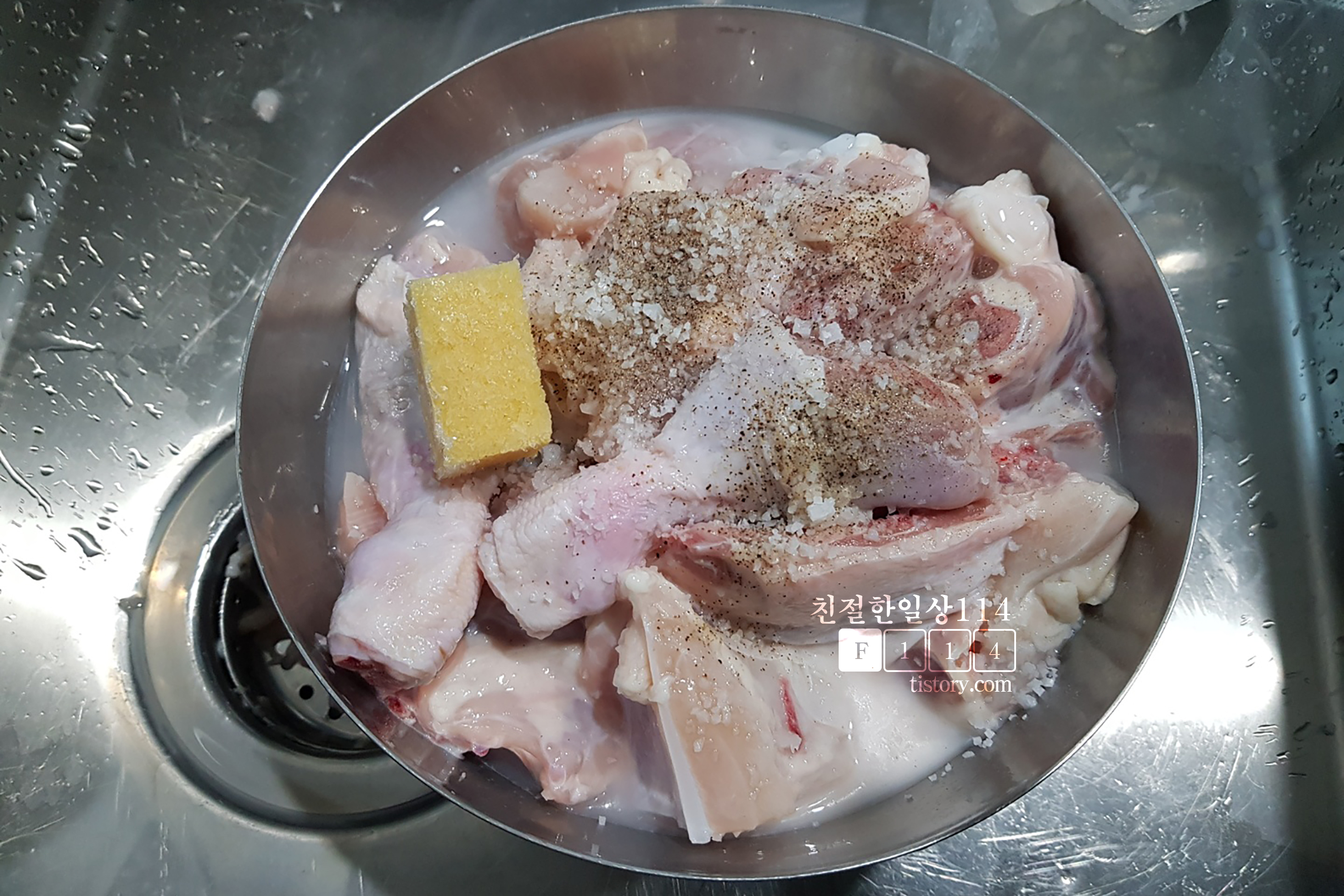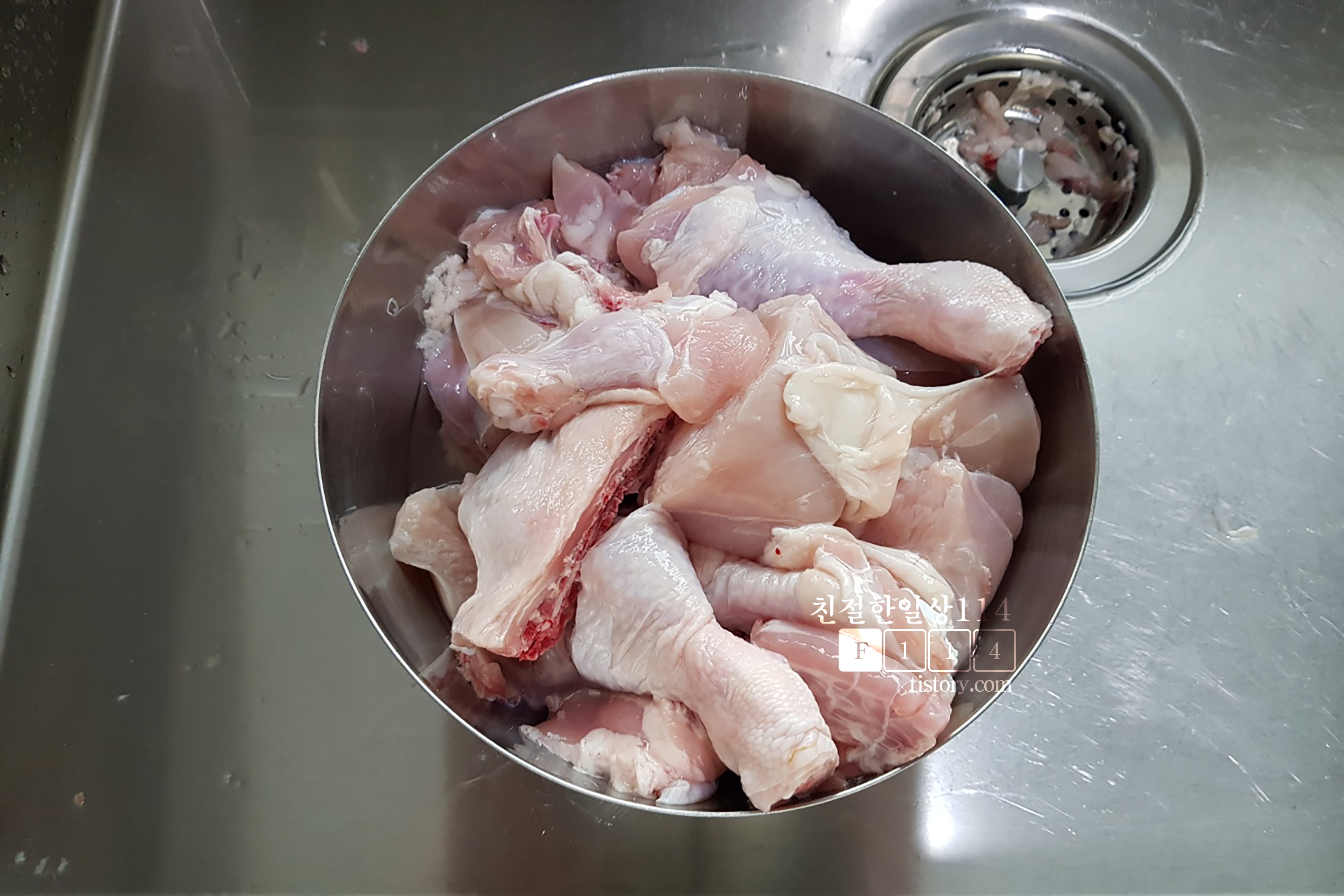 냉장닭을 손으로 주물러서 물에 몇차례 씻어준다.