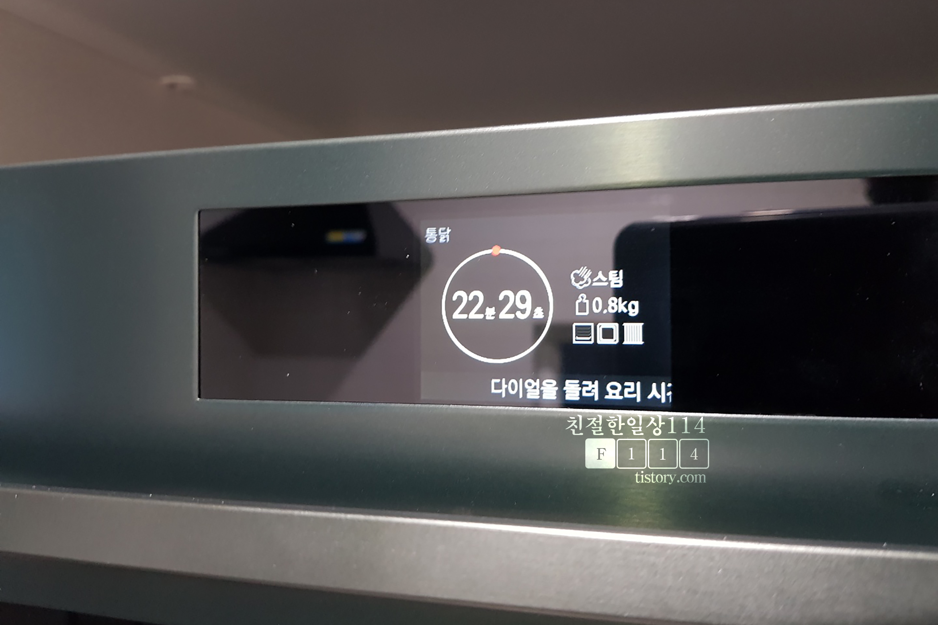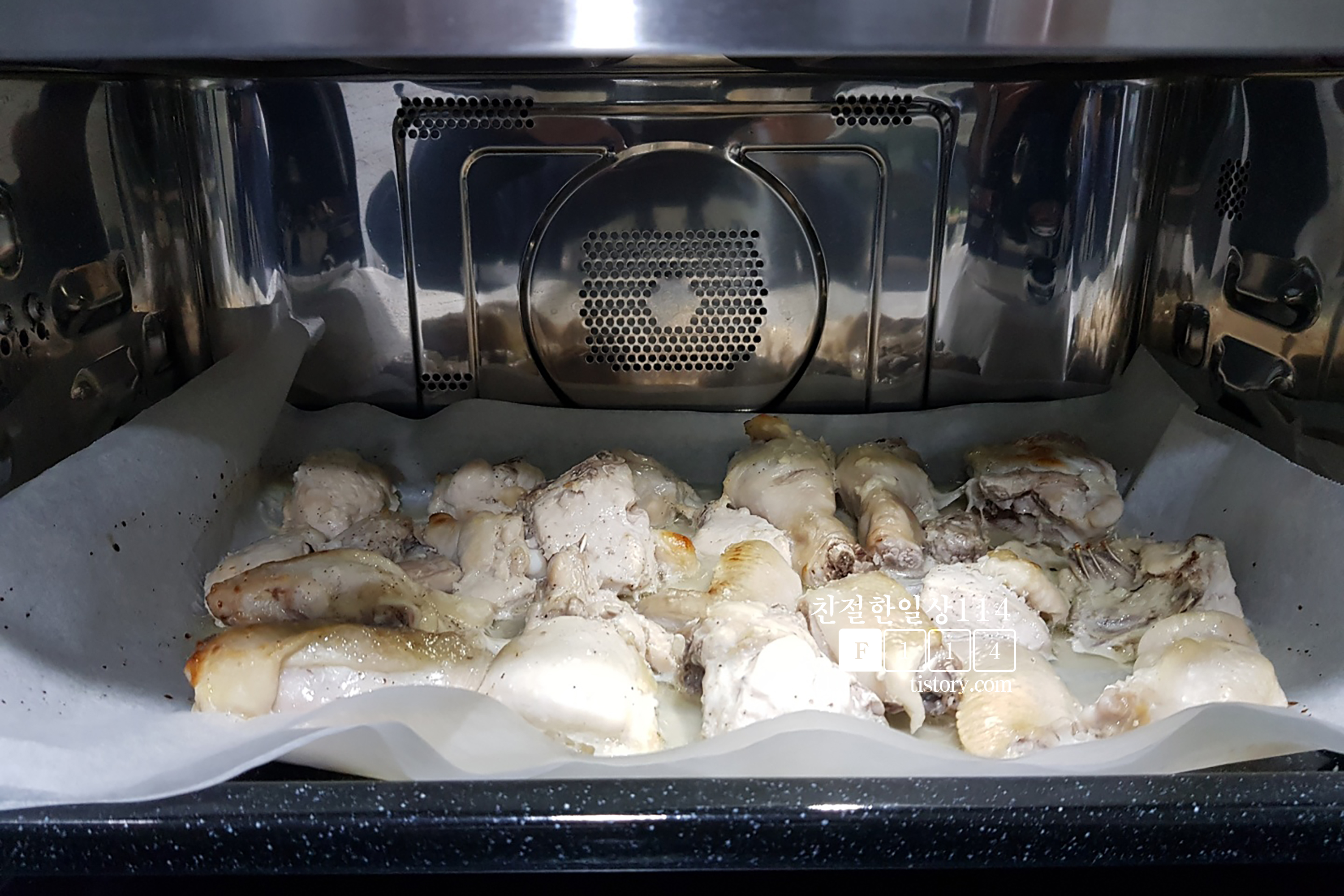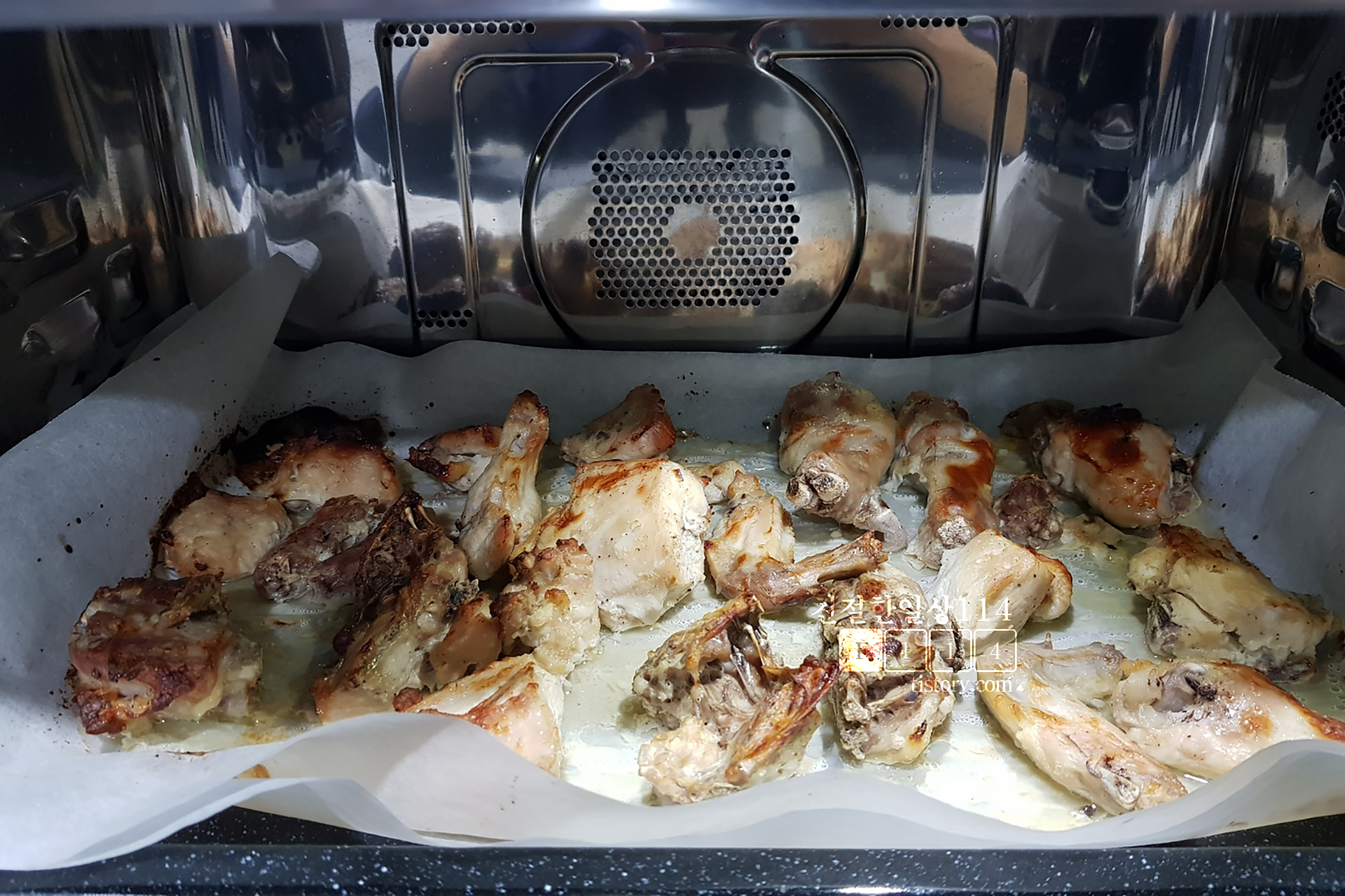 오븐에 넣은 뒤 오븐-통닭 자동요리 기능을 선택해서 조리를 시작한다. 자동요리 기능이 없다면 오븐에 맞춰놓고 예열없이 오븐, 스팀, 23분에 맞춰놓고 조리하면 된다.