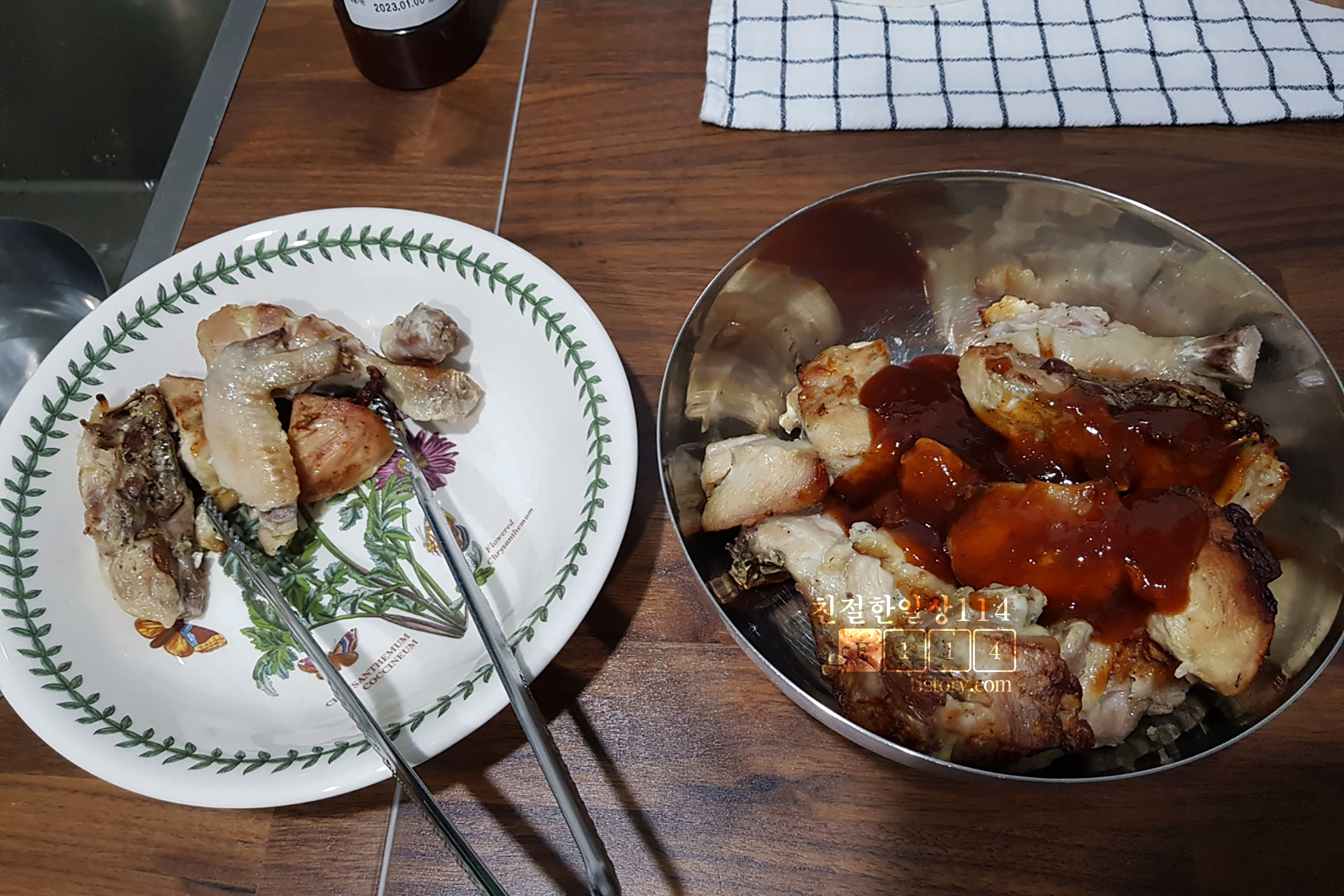 집에서 요리를 이것저것 하다보니 음식솜씨가 조금씩 는다. 뭔가를 연습하고 계속해서 하다보면 보다 잘 하게 되고 실력이 느는 것이 당연하다. 이제 간단한 밑반찬과 국, 찌개, 탕은 우리 가족이 먹기 좋을 정도로 간을 맞추는 실력이 되었다. 이쯤 되니 기본적인 밥과 찌개, 반찬 말고 다른것에 도전해 보고 싶어진다. 마트에 장보러 갔다가 토막낸 냉장닭이 보여서 순간 양념치킨을 해먹어보자는 생각이 들어 냉장닭과 양념치킨소스를 사서 돌아왔다. 머릿속으로는 이미 처갓집 양념통닭을 기대하며 집에 돌아와 저녁밥을 먹고는 양념치킨이라는 새로운 메뉴에 도전해 보기로 한다. 그런데 막상 하려니 배도 부르고 아까 마트에서 닭을 보며 차 올랐던 의욕이 생기지 않는다. 이제는 처갓집 양념치긴이 아니라 기름에 튀기고 어쩌고, 설거지하고 이런것들이 떠오른다. 그래서 기름에 튀기지 않고 얌전히 오븐을 이용해 양념치킨을 시도해 본다. 생각보다 간단하고 의외로 맛은 괜찮은 오븐으로 하는 양념치킨을 소개해 본다.