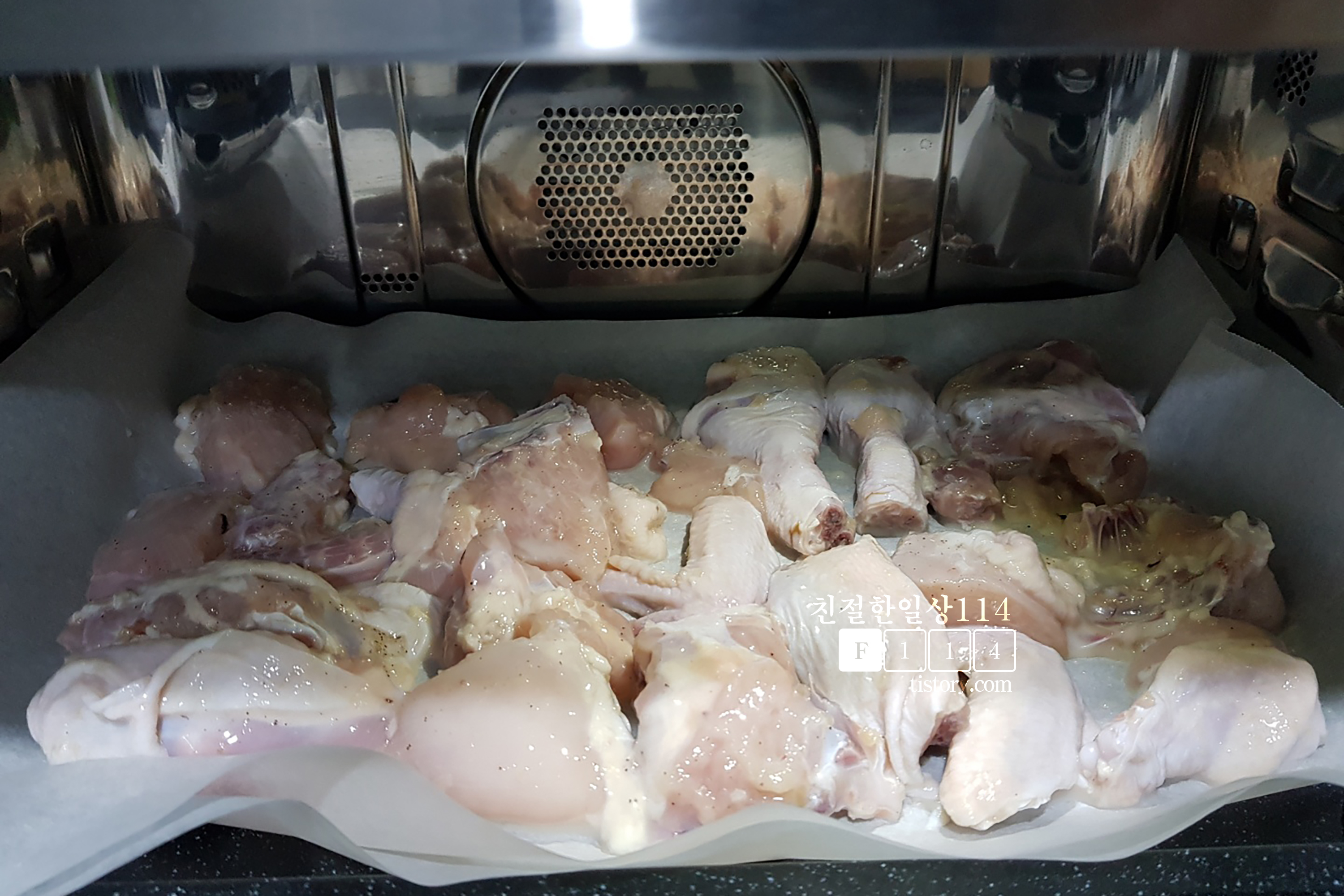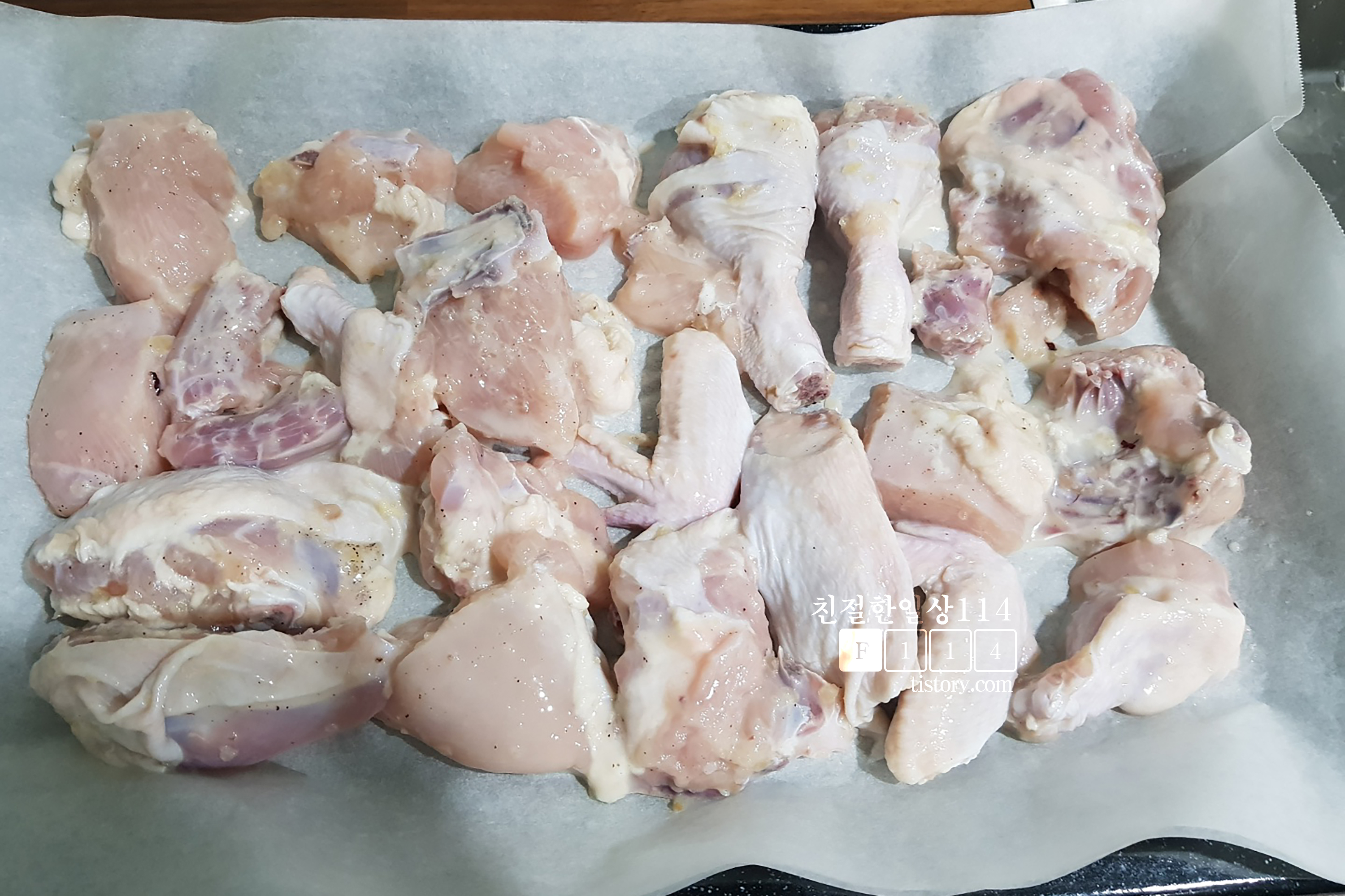 밑간해서 재워둔 닭을 오븐용 접시에 종이호일을 깔고 고르게 펴서 올려놓는다. (이때 닭에 올리브유를 발라주거나 뿌리고 오븐에 구우면 통닭으로 먹을 수 있다)