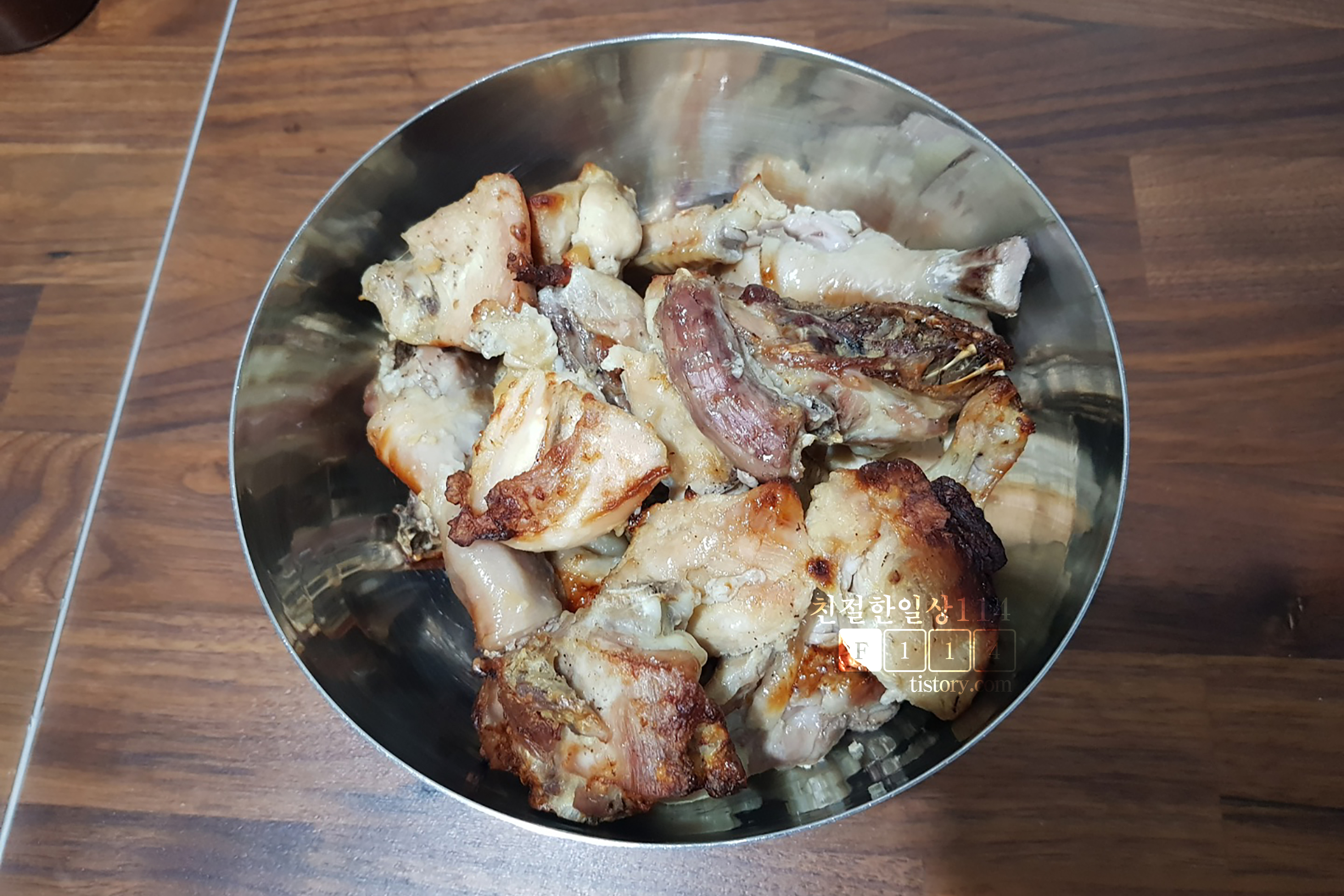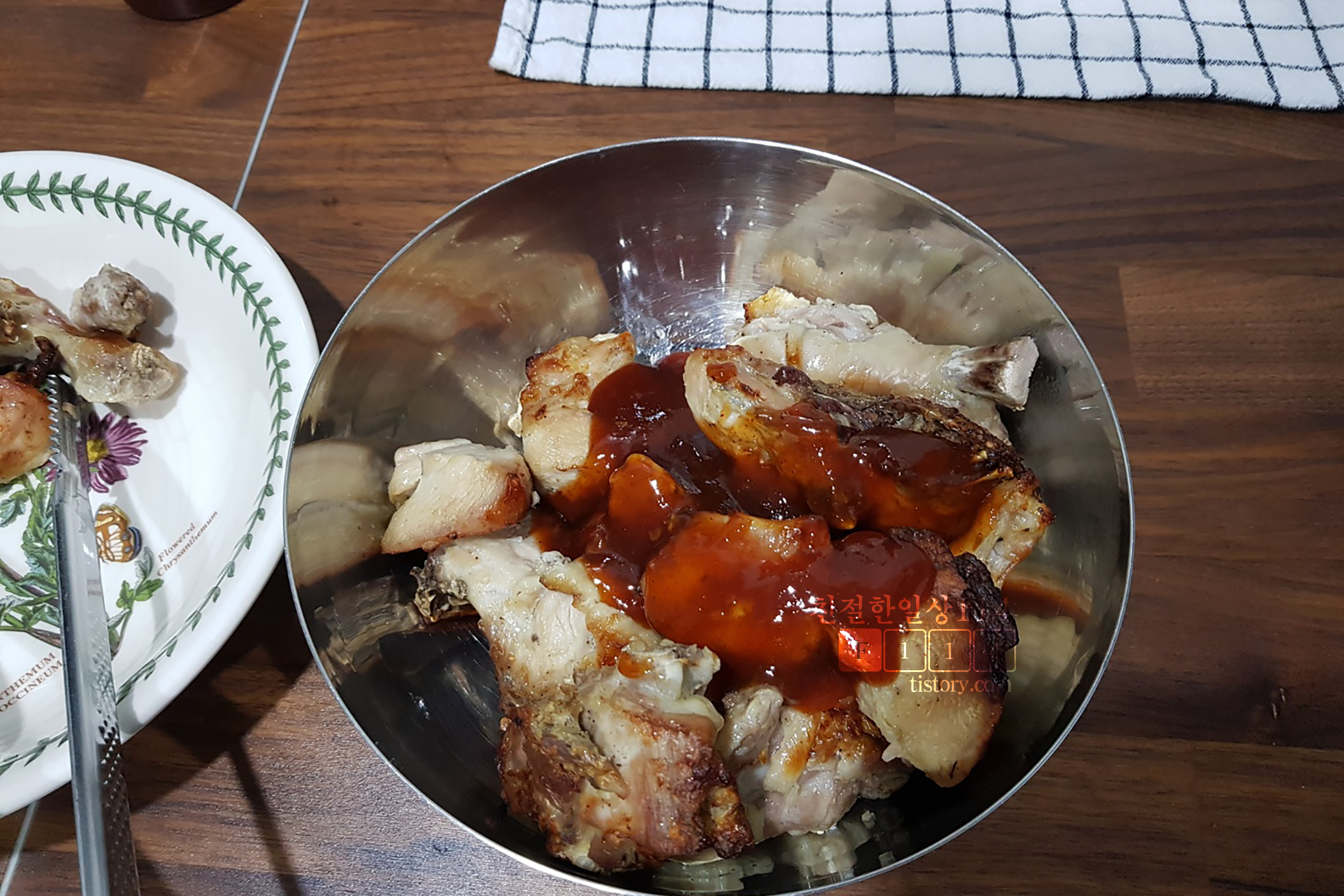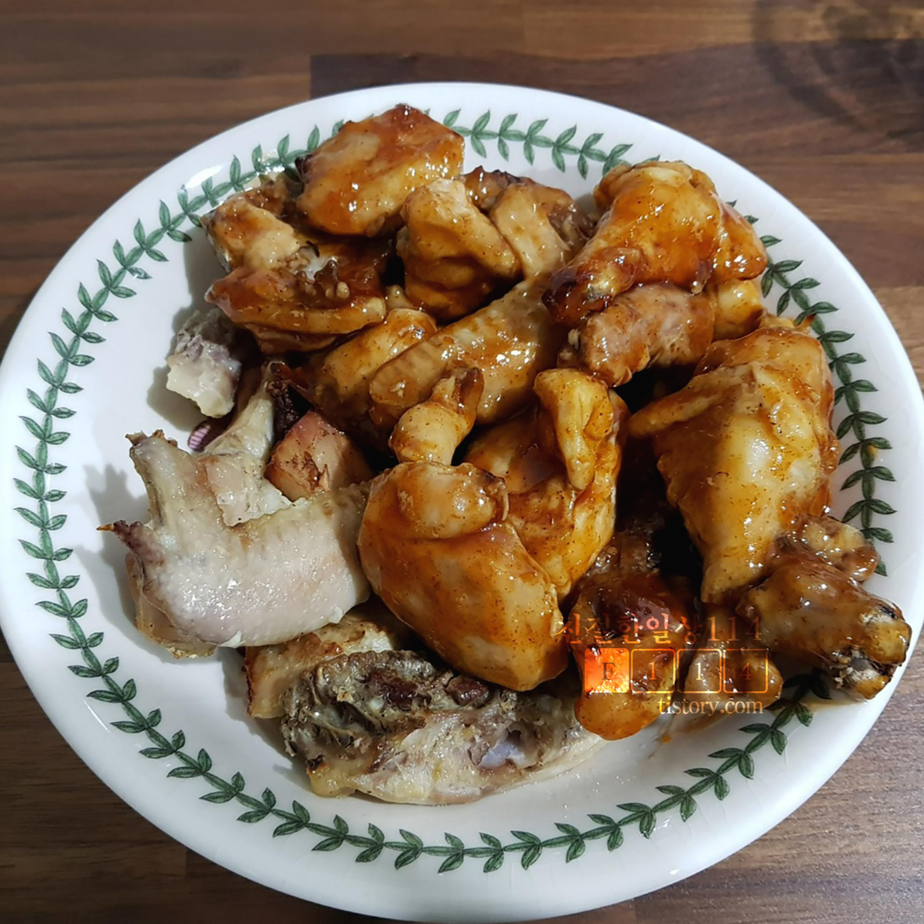 요리에 자신감이 붙어 새로운 시도로 해본 메뉴였다. 간단하고 편하게 하려다보니 기름에 튀기지 않았고, 그러다보니 배달시켜먹는 양념치킨과는 전혀 다른 메뉴가 되어버렸다. 이렇게 요리하니 육질 좋고 간과 소스가 잘 베어있는 치킨 맛을 볼 수는 있었다. 다만 치킨에는 튀김옷이 있어야 하며 양념소스의 중요성이 따라줘야한다. 다음에는 조금 번거롭더라도 후라이팬에 튀겨서 해야 겠다.