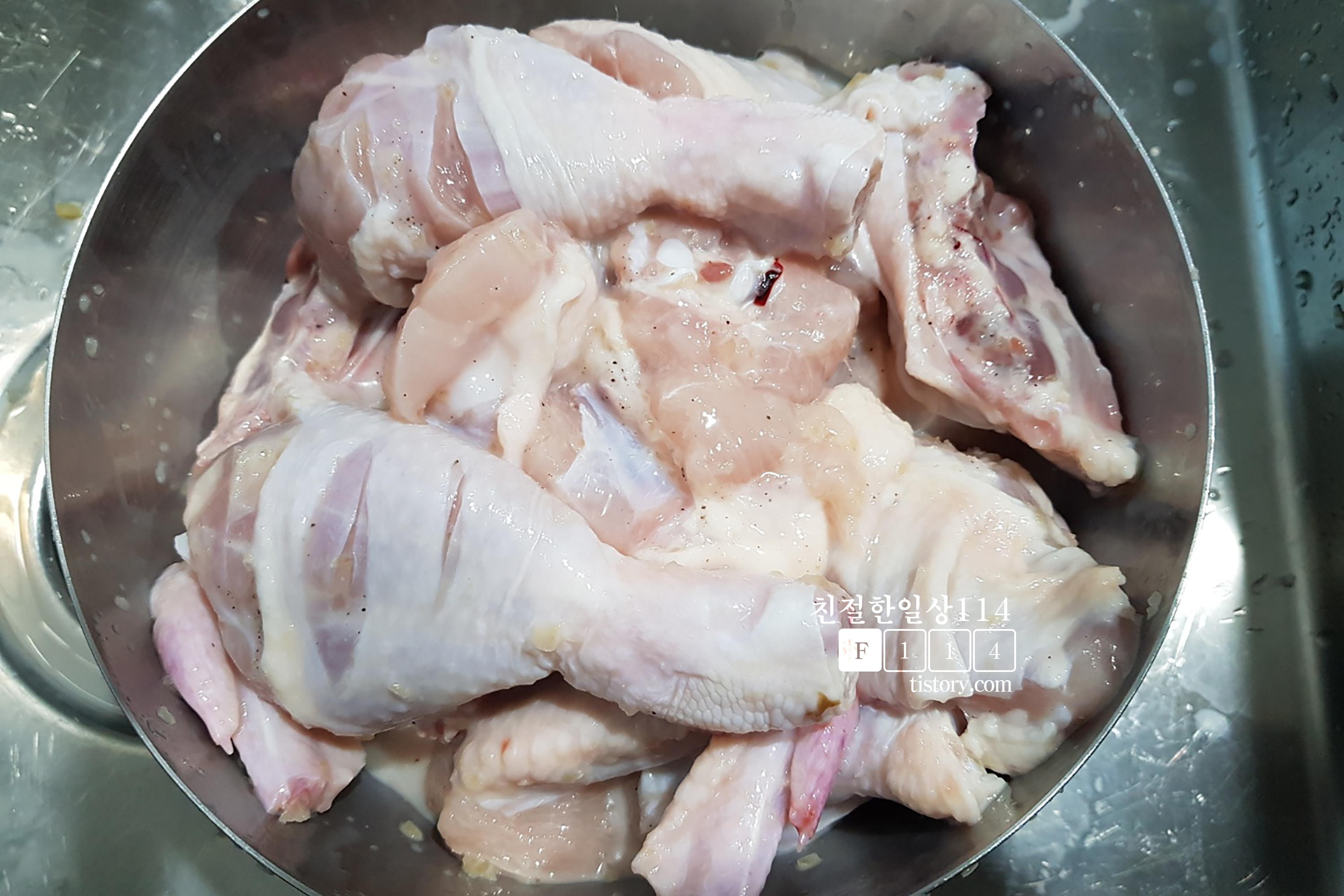 : 토막낸 냉장닭 / 양념치킨소스 / 우유 / 다진마늘 1스푼 / 맛술 / 소금 / 후추(조금)