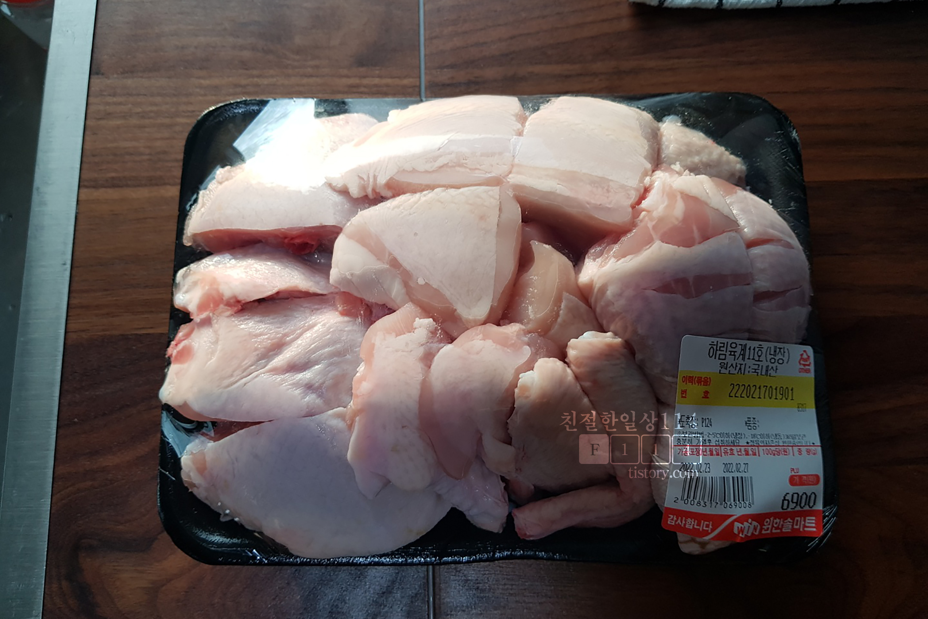 마트에서 사온 토막낸 냉장닭 중간크기인 육계11호다. 치킨집에서 사용하는 닭은 11호를 쓰기도 하는데 육계 가격이 비쌀때면 좀 더 작은 9호에서 10호를 사용하기도 한다. 치킨을 시켜먹었을때 평소보다 닭이 작게 느껴지거나 양이 적게 느껴졌다면 느낌이 맞다! 9호나 10호 닭을 사용했을 것이기에.
