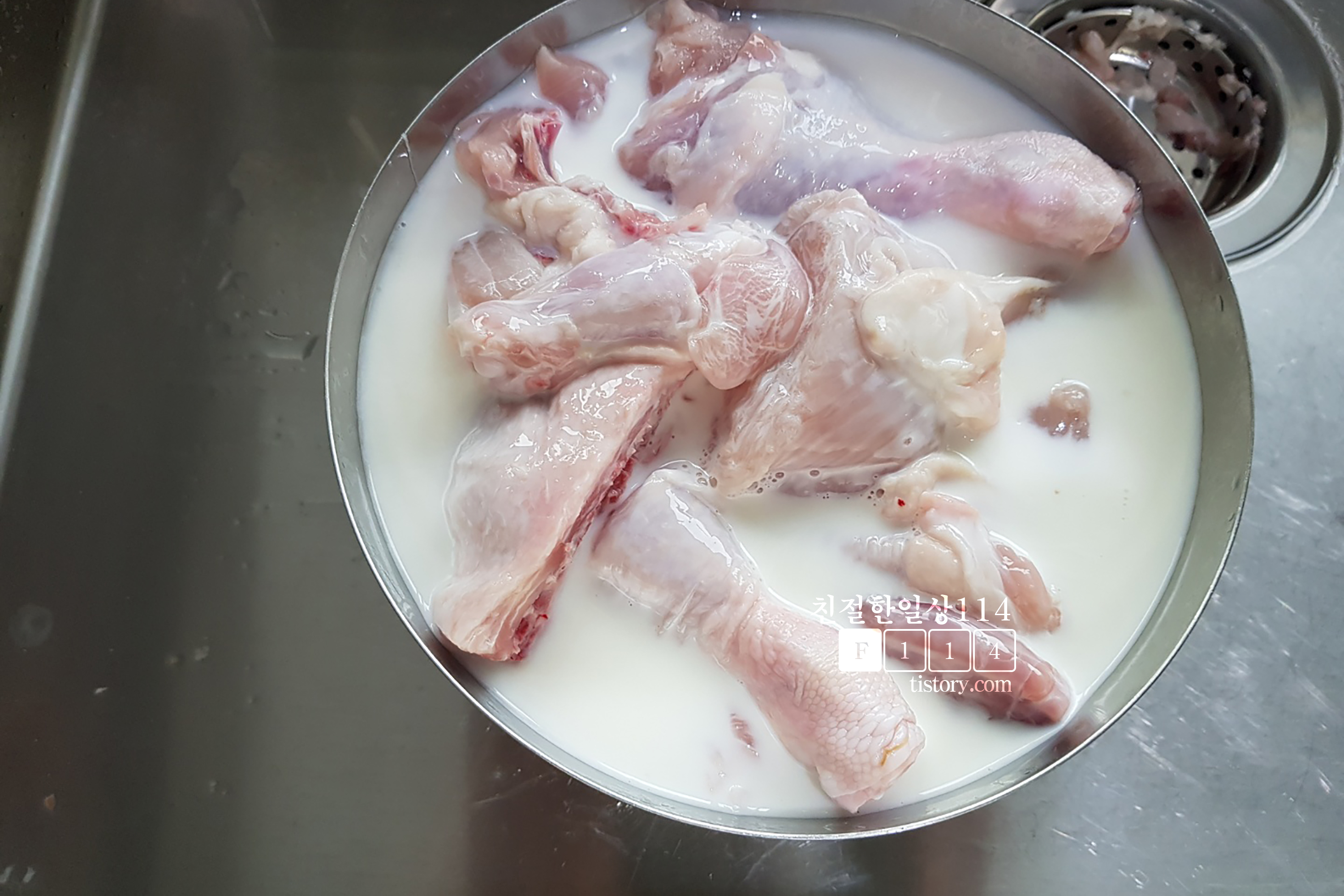 그리고 잡내를 없애고 고기를 부드럽게 해주기 위해서 우유를 닭이 잠기게 부어준 후 30분정도 둔다. 마침 냉장고에 유통기한이 며칠 지난 우유가 있어서 부어준다.