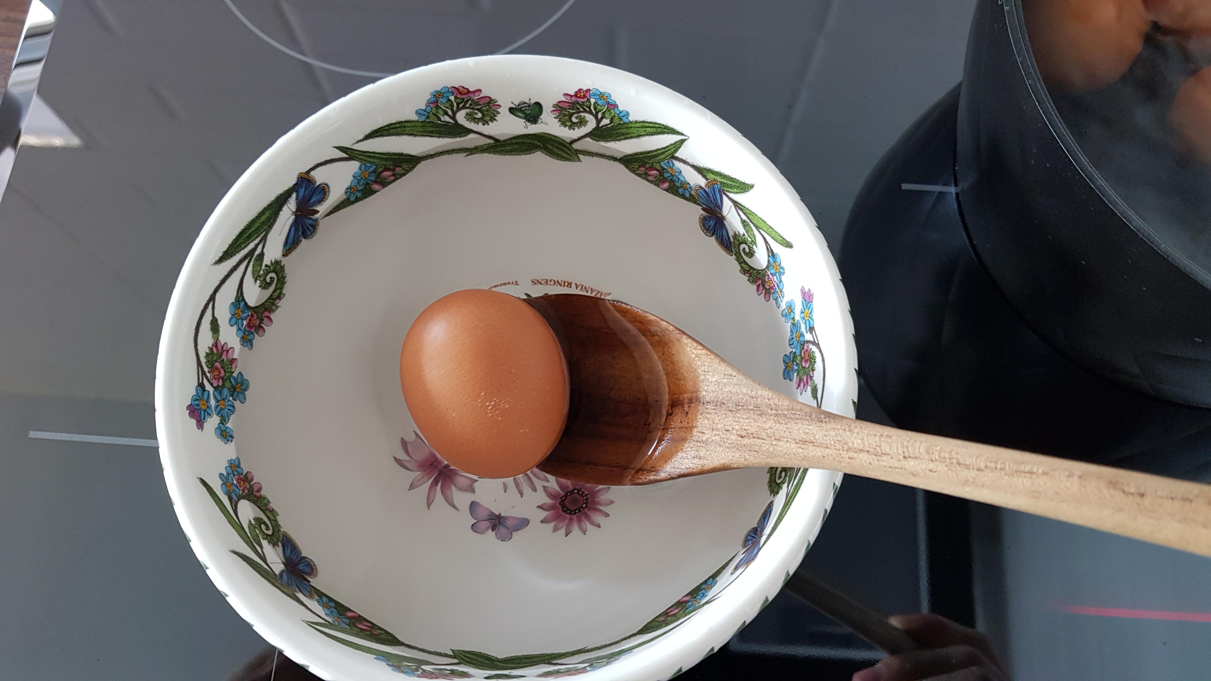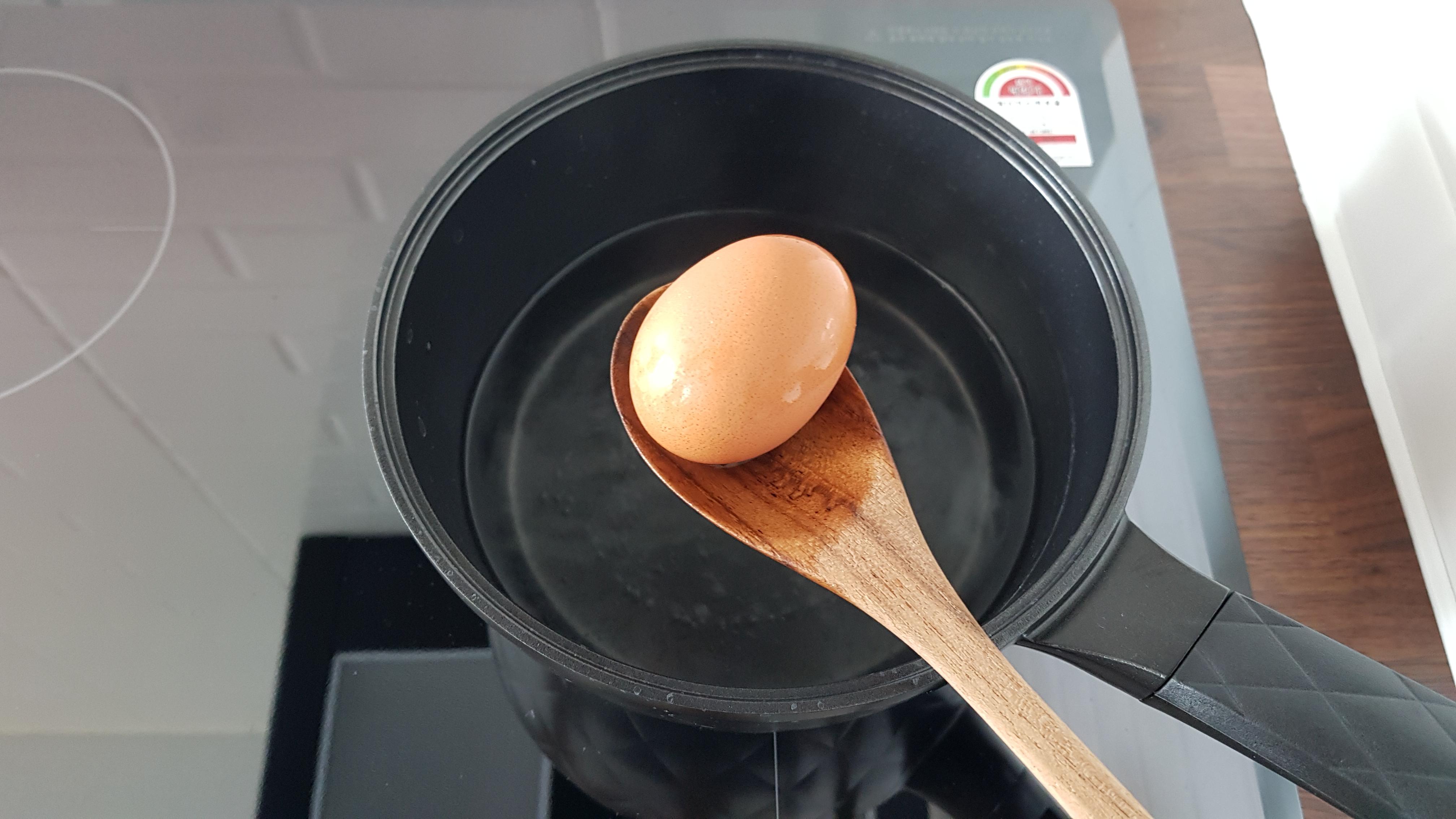 물이 끓고 4분이 지나 계란을 하나 건져 준비한 찬물에 옮겨 담는다.