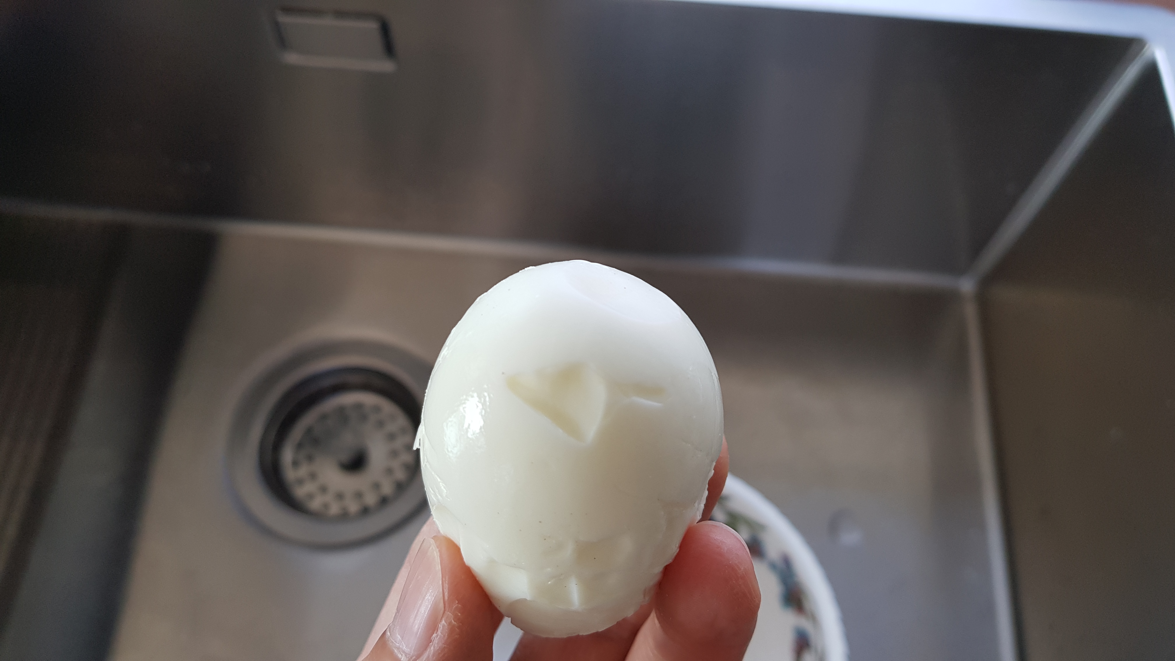 어라? 그렇게 했는데도 맨 처음 건진 계란은 듬성듬성 잘 안까진다. 원인은 뒤에 다음 계란을 찬물에 담가야해서 짧게 찬문에 담갔기 때문이다. 정말 차가운 물이라면 2분정도 담가두면 되지만 그냥 밍밍한 찬물이라면 중간에 물을 갈아주고 3분~5분정도는 담가둬야 잘 까진다.