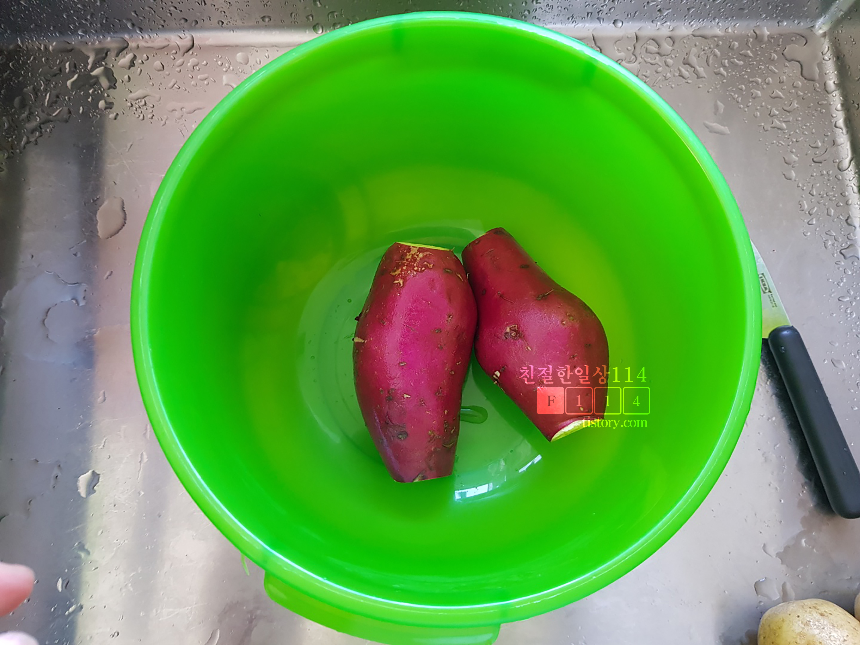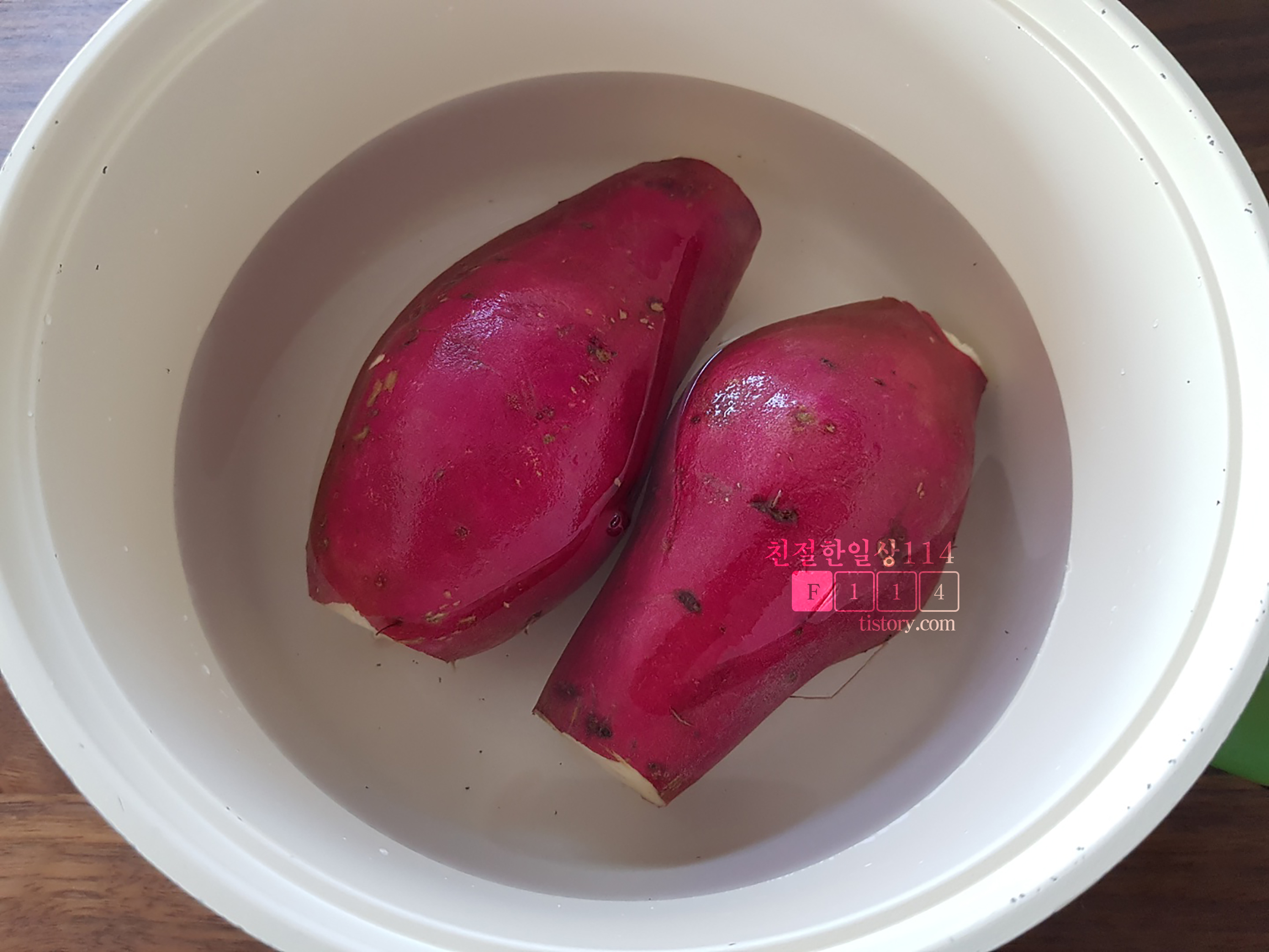 깨끗이 씻은 고구마는 양쪽 끝을 잘라내 준다. 잘라낸 단면으로 수분이 흡수되어 속이 촉촉하게 삶아지게 된다.