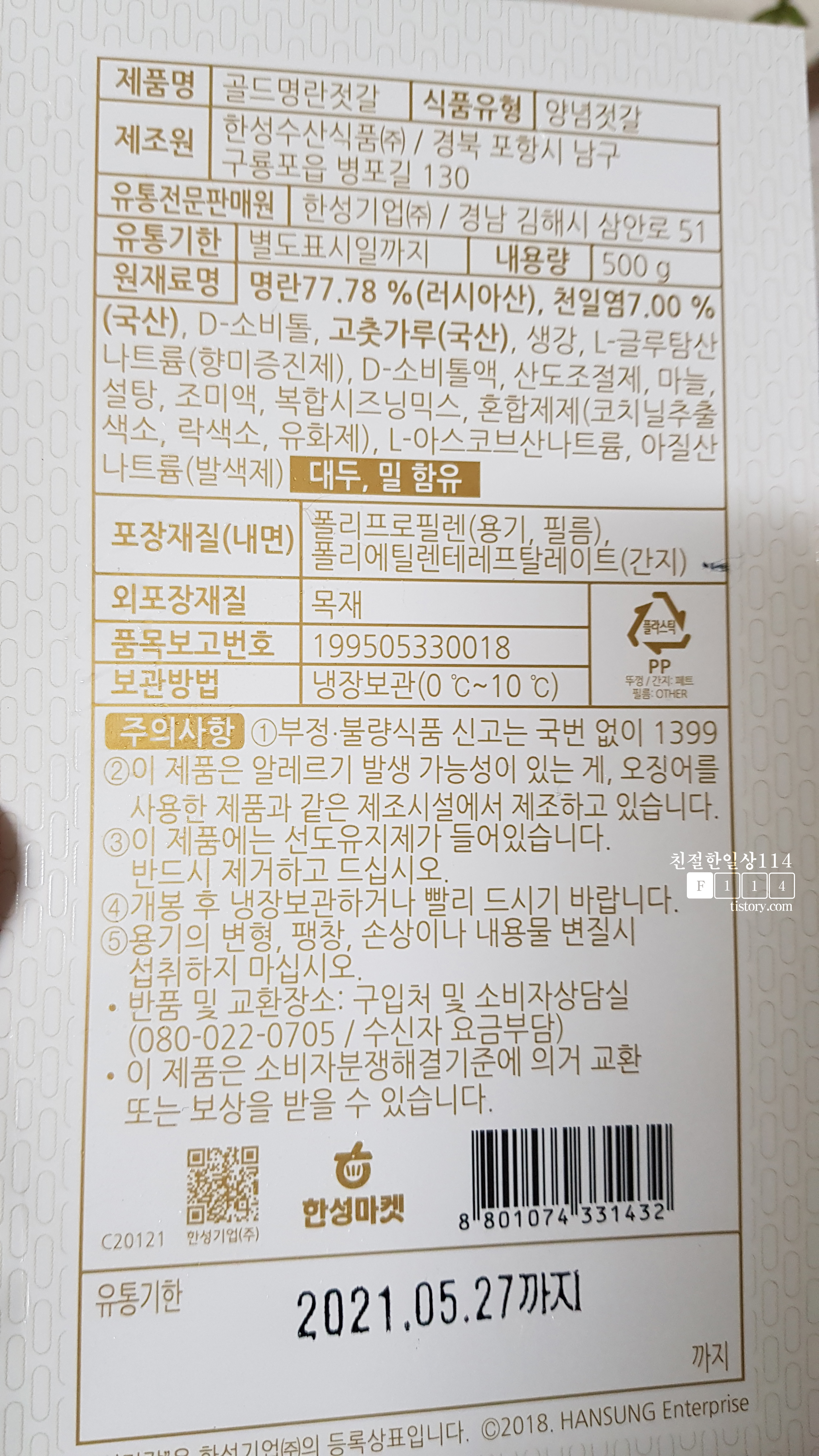 냉장된 명란젓은 유통기한이 약 10일 ~ 15일 정도로 길지가 않다. 요리할 만큼만 꺼내두고 나머지는 냉동보관해야 오래 두고 먹을 수 있다.