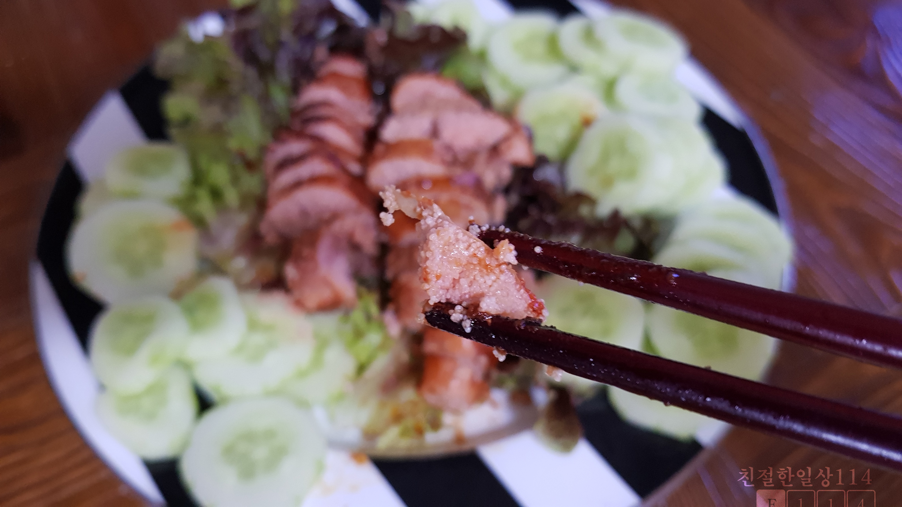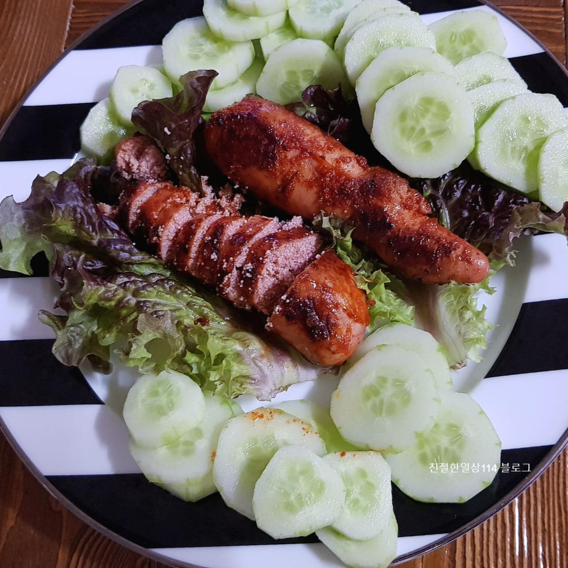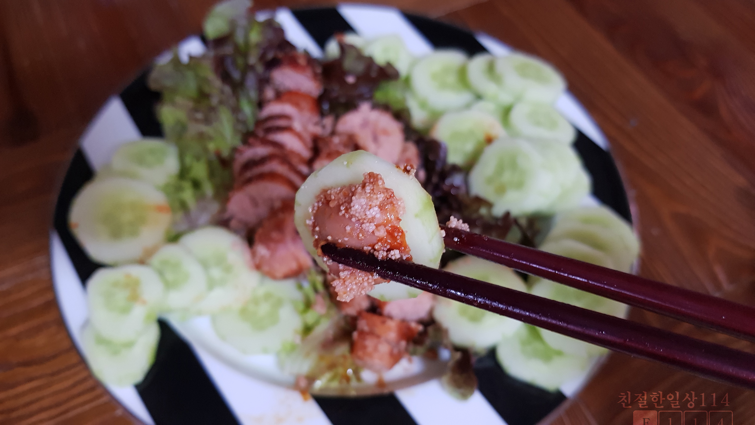 이렇게 시원하고 아삭한 오이와 같이 먹으면 짠맛을 중화시켜주고 상큼함이 더해져 딱 좋다.