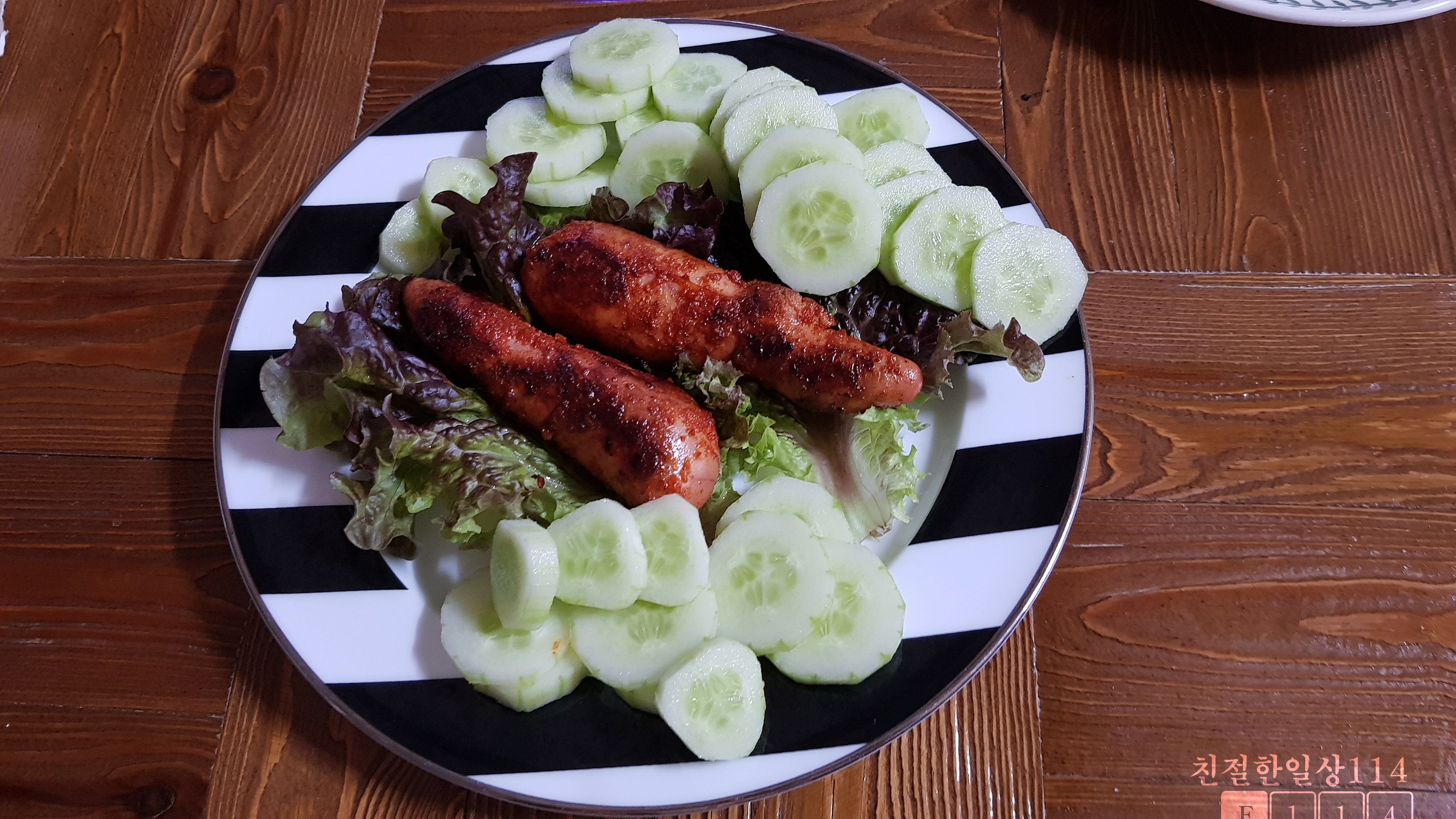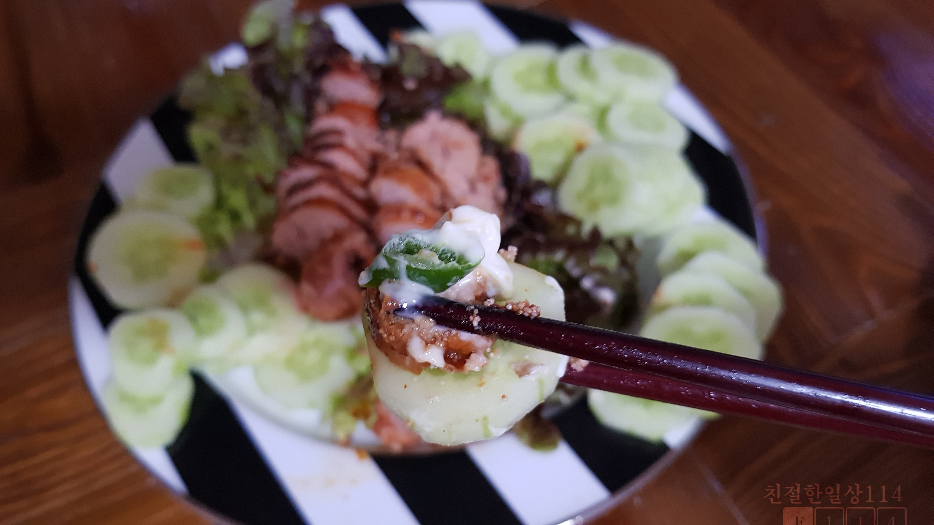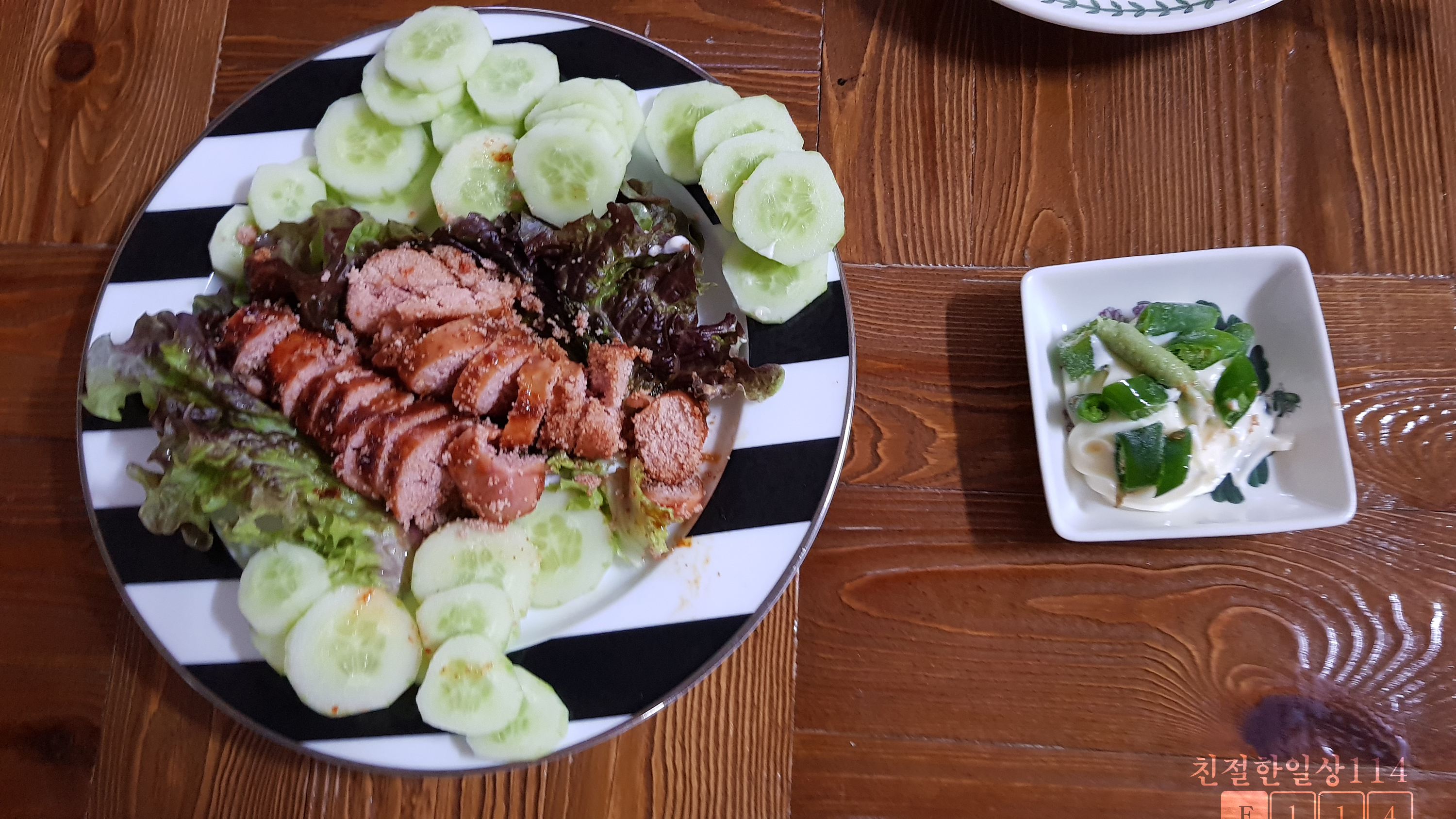 이렇게 시원하고 아삭한 오이와 같이 먹으면 짠맛을 중화시켜주고 상큼함이 더해져 딱 좋다.