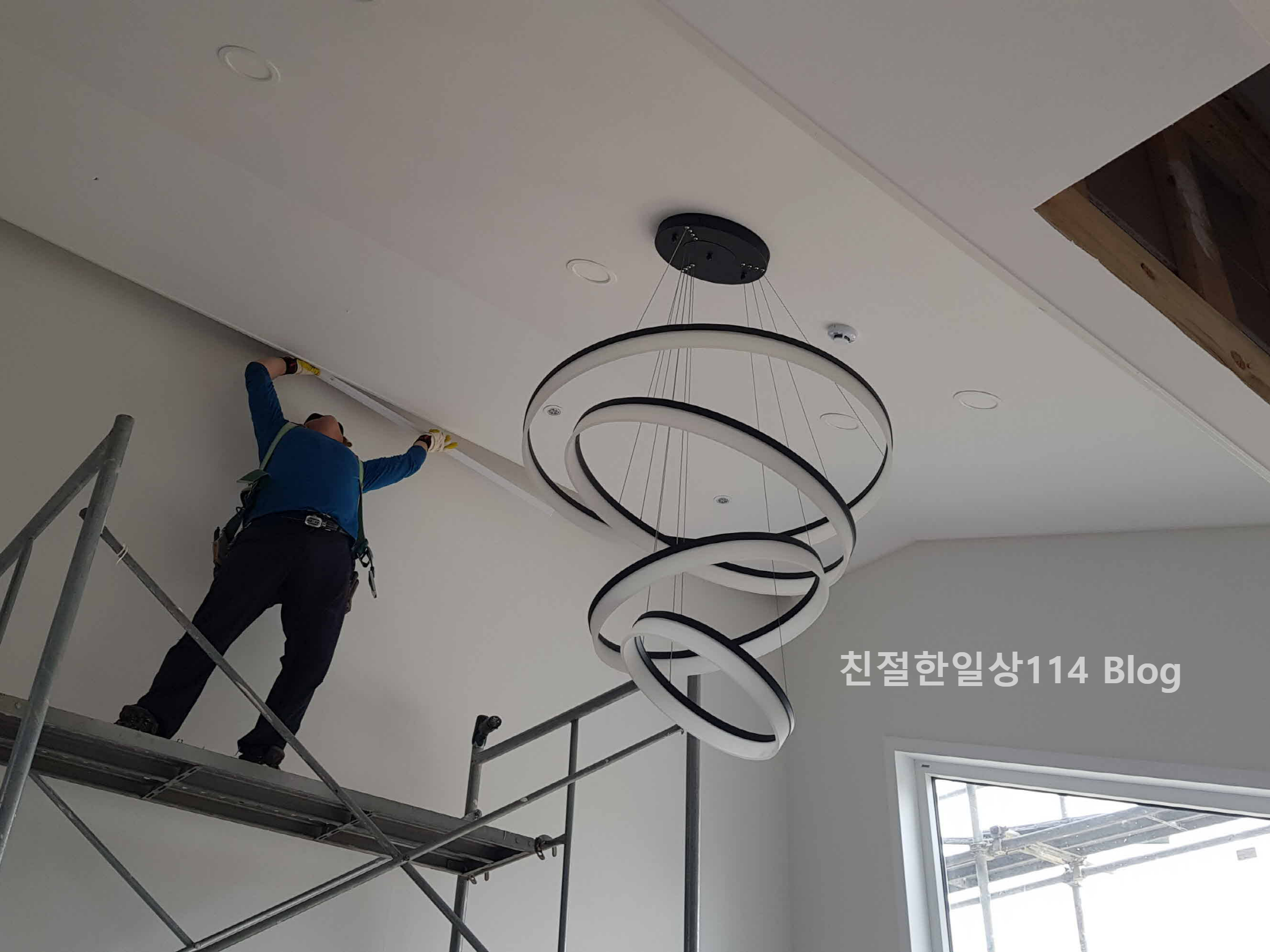 그리고 전기업체에서 전기기구를 달면서 거실 조명 설치도 한다. 설치당시에 전기는 차단이 된 상태로 감전의 위험은 없지만 워낙 높아서 낙상의 위험이 따른다. 실내 비계에 올라가 전기업체 사장님과 현장 대리인 두명이서 설치작업을 진행한다.  필자도 현장에서 설치 작업을 도우며 조명 줄 길이를 조율하고 설치를 끝낸다.