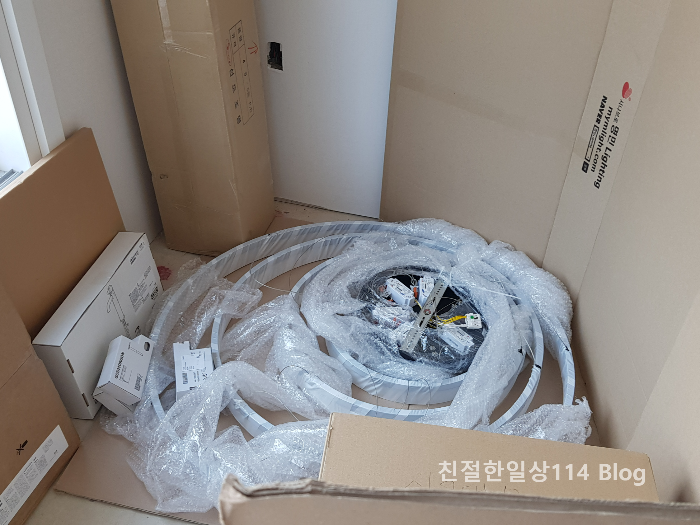 집 전기기구 설치일정에 맞춰 구입한 거실 조명을 가져다 놓는다.