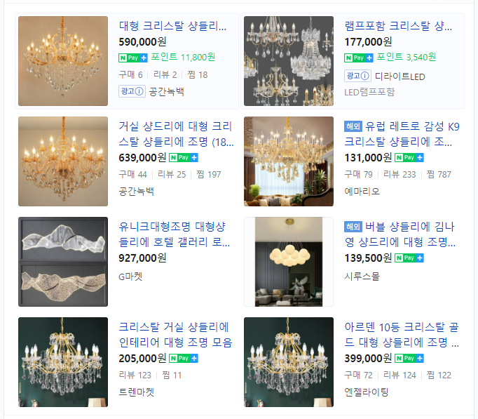 거실 조명으로는 샹들리에를 생각하고 보러 다녔었는데 샹들리에 조명은 사람들이 많이 찾지 않고 찾더라도 작은 사이즈 위주로 구매하기에 원하는 크기의 샹들리에는 볼 수가 없었다