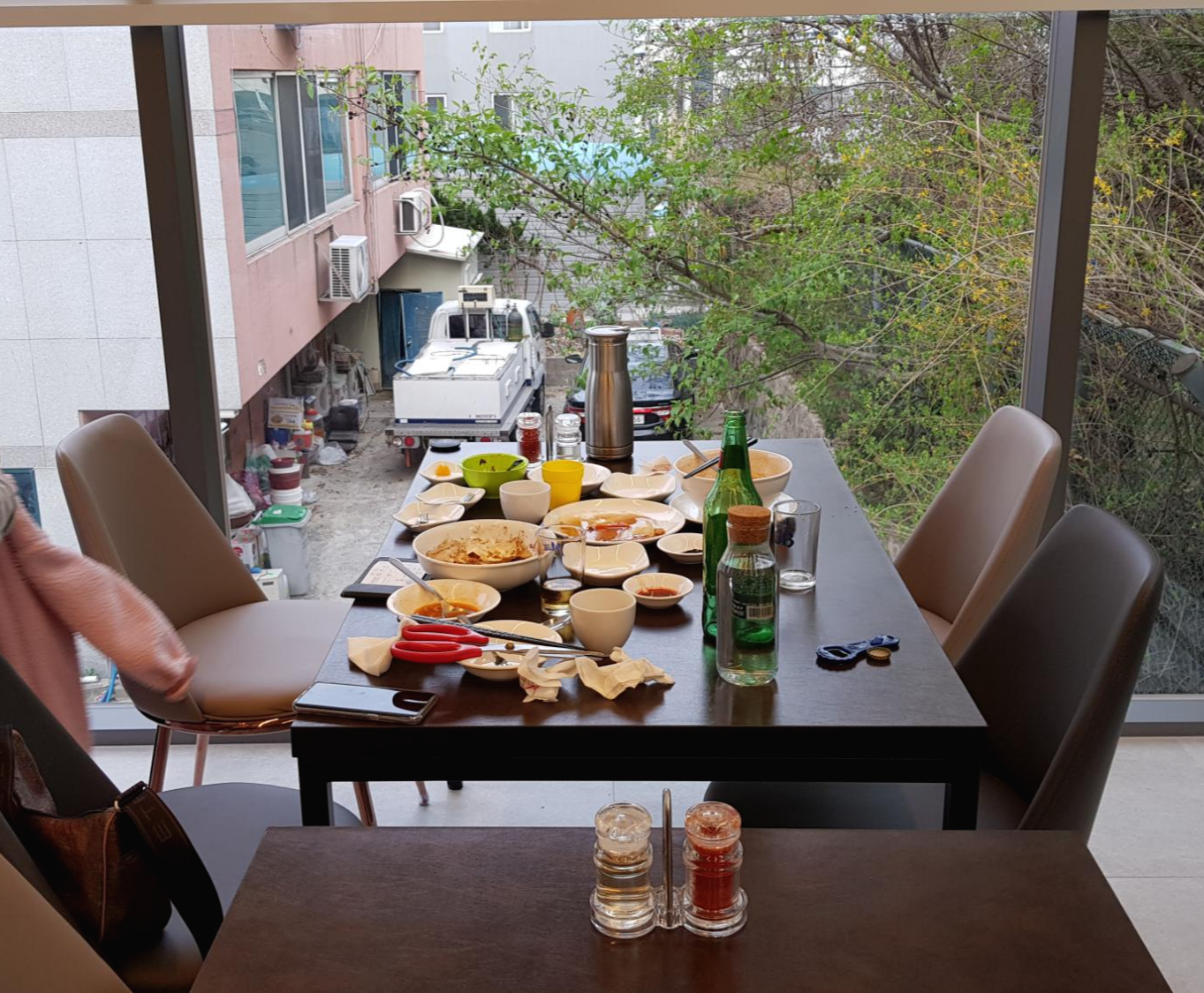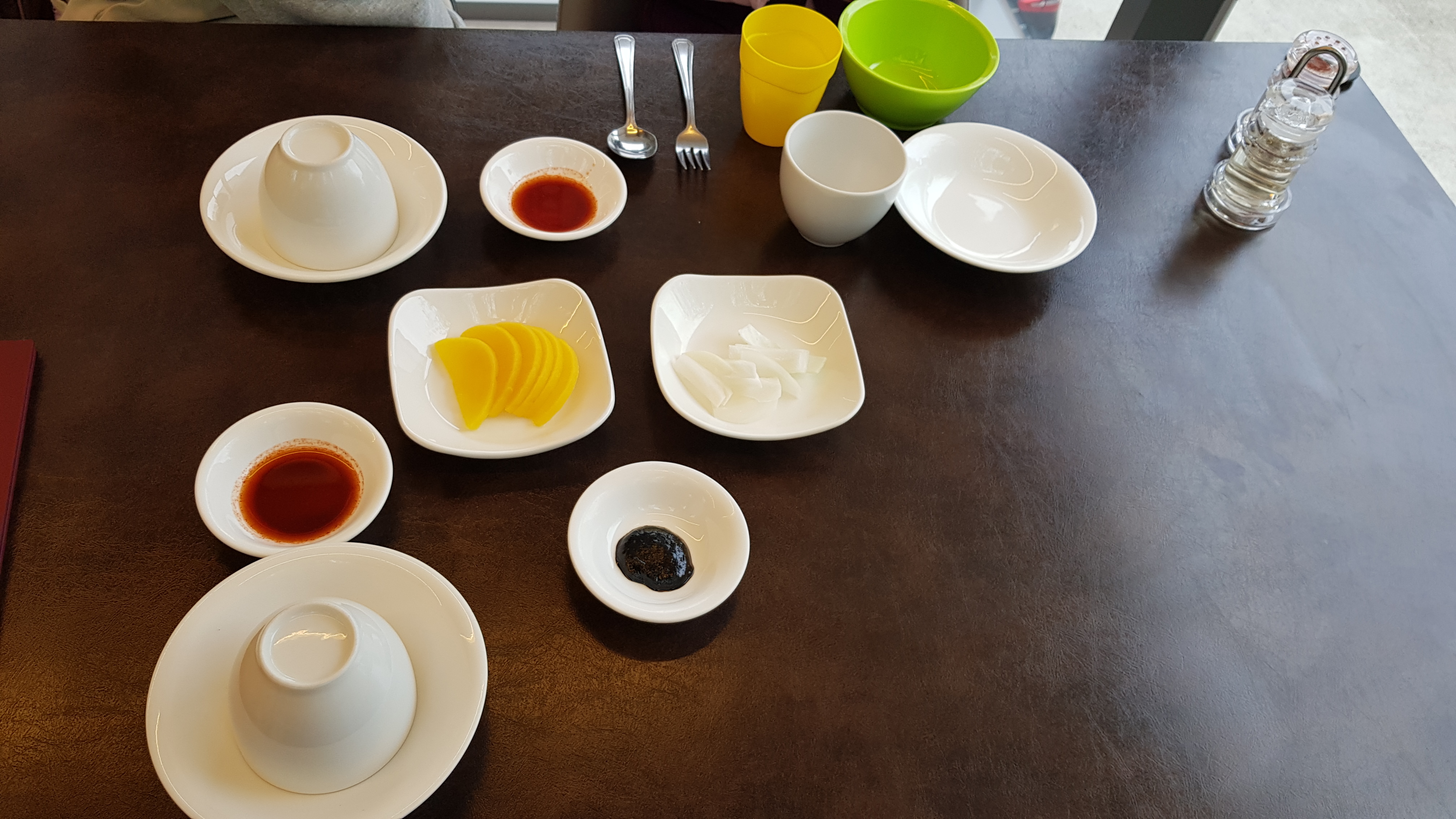주문 후 식기와 기본 반찬이 나온다. 물을 빠뜨린건지 아직 익숙치 않아서 인지 물이 나오지 않아 칭따오와 함께 물을 주문한다. 다른 테이블에서도 물을 가져다 달라고 하는 것이 들린다. 물을 처음 식기를 가져다 주며 같이 가져다 주면 직원분들도 수고를 덜 것 같다.