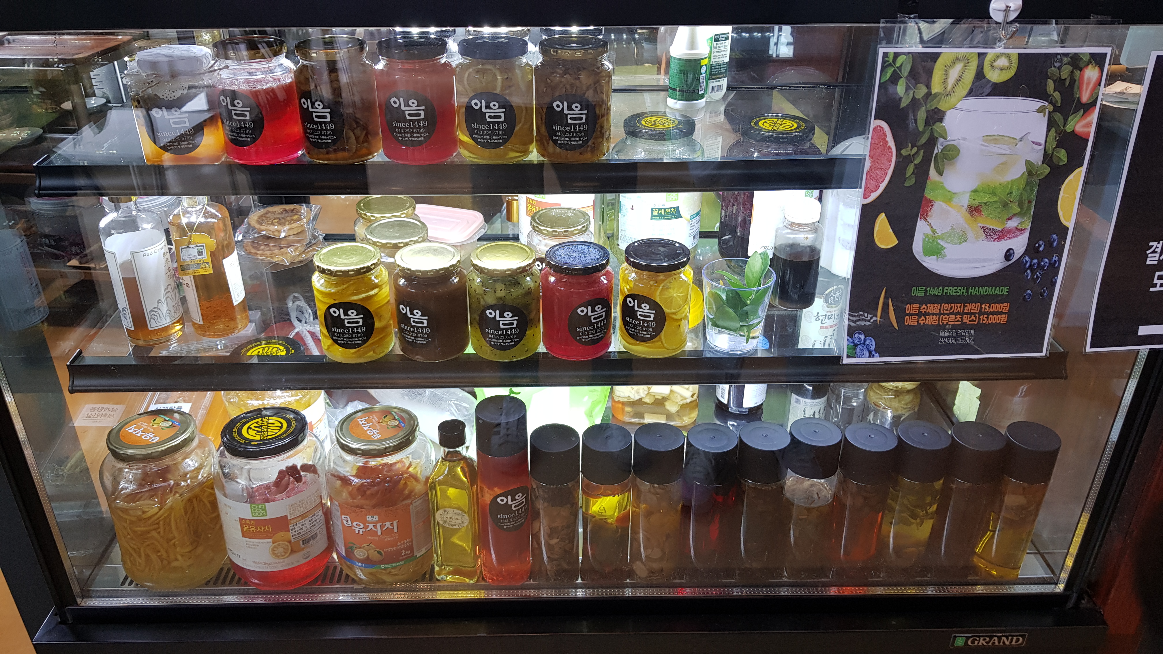 카운터에 있는 유리장에는 판매되고 있는 이음 수제청이 있다. 이음 수제청은 한가지 과일 수제청은 한병에 13,000원 여러가지 과일이 들어간 수제청은 15,000원 이다.