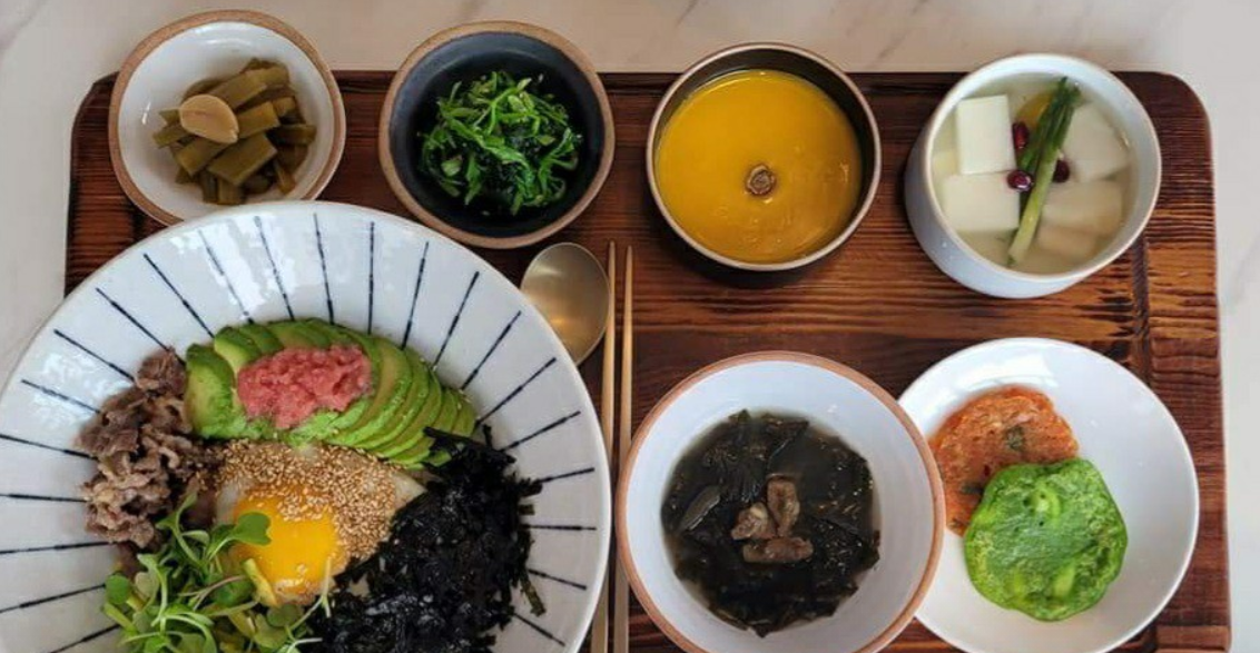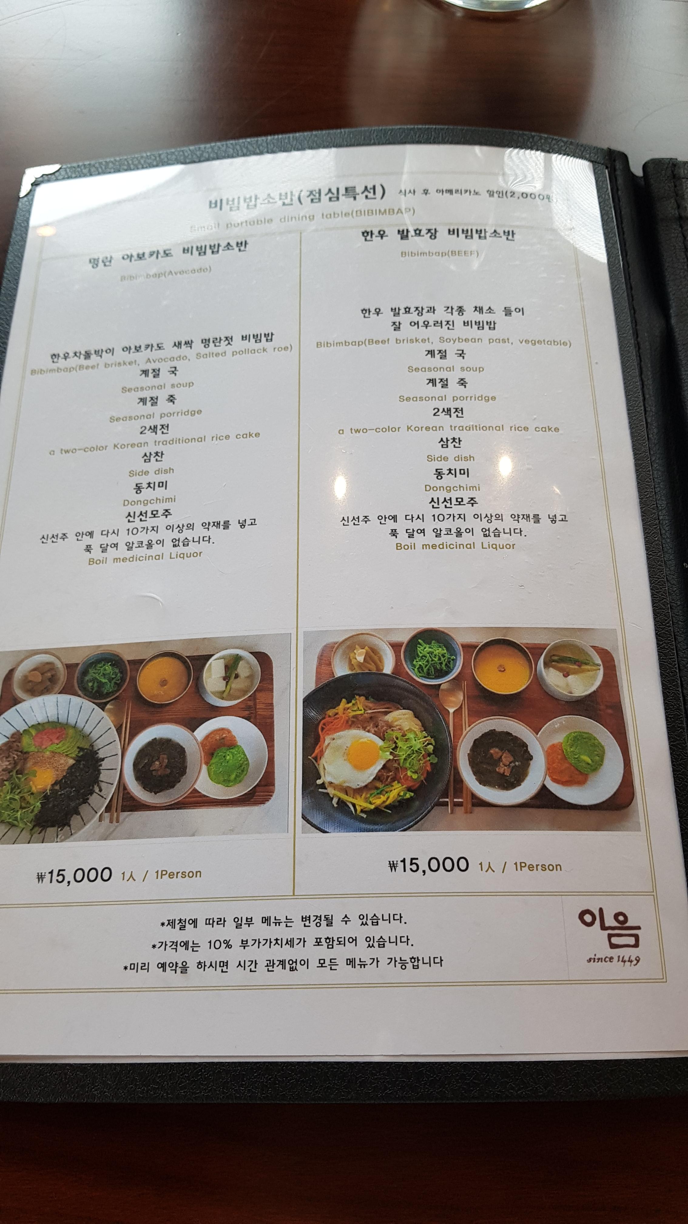 비빔밥소반은 점심특선으로 제공이 된다. 메뉴로는 명란 아보카도 비빔밥소반과 한우 발효장 비빔밥 소반 두가지 이며 가격은 15,000원.