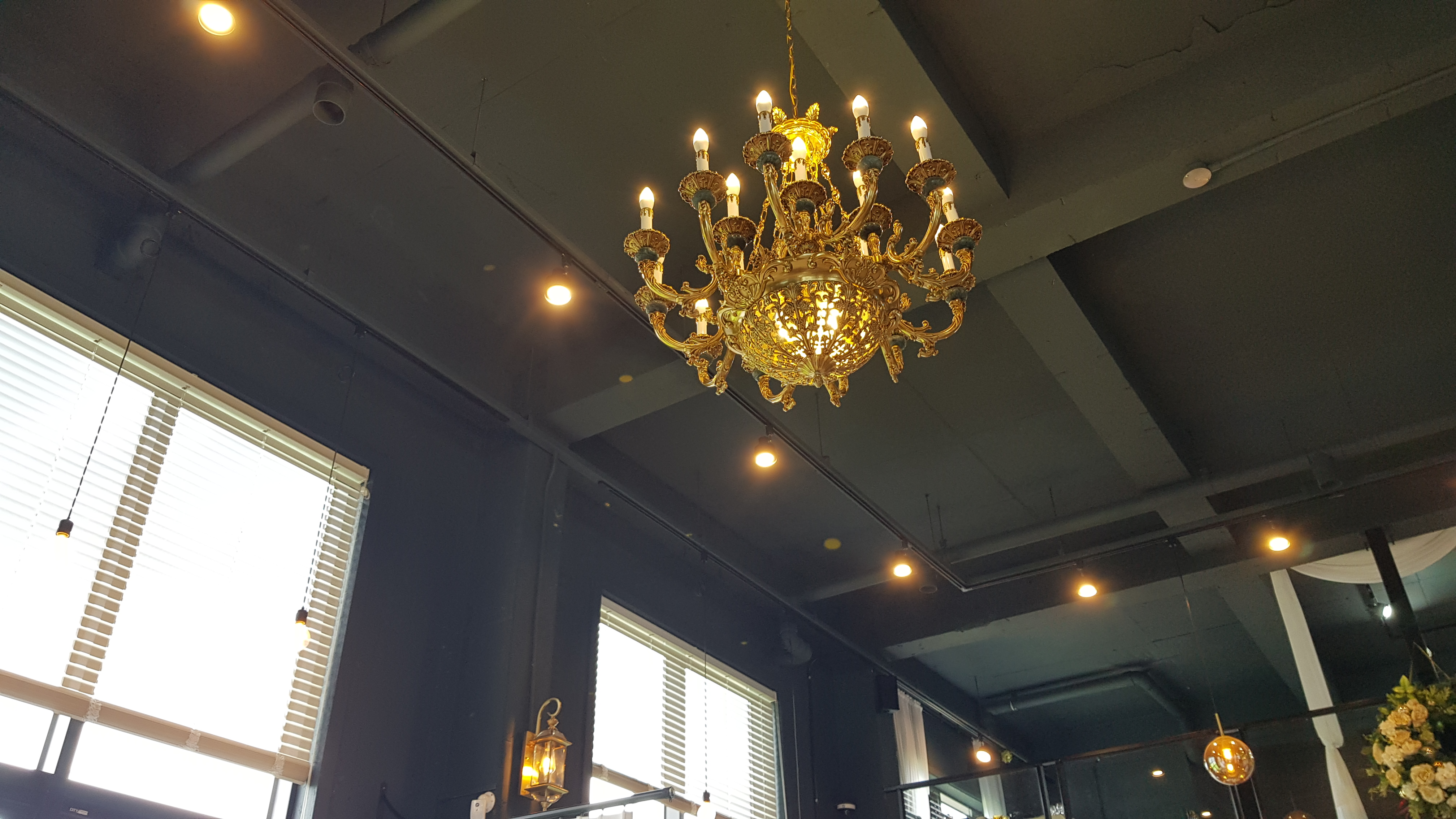 성당에서 사용했을것으로 생각되는 샹드리에가 천장에서 빛을 발하고 있다. 식당의 분위기와 매우 잘 어울린다.