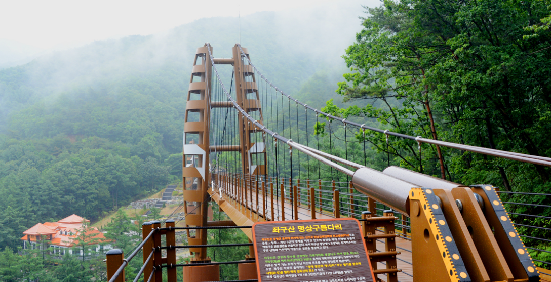 - 설명: 높이 50M, 폭 2M, 총장 230M의 출령다리로 좌구산 휴양랜드의 랜드마크이다. 좌구산 명상 구름다리는 좌구산 숲 명상의 집과 바위정원, 자작나무 테마숲길을 연결하며 다리 위에서 바라보는 좌구산과 삼기 저수지의 풍경은 장관을 이룬다.