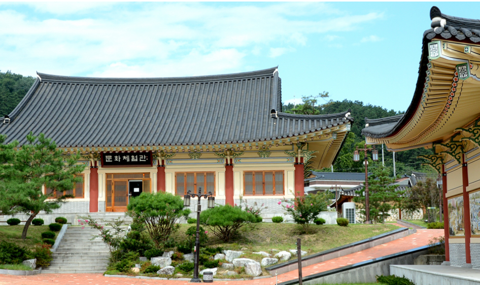 두레관이 먼저 보이고 그 뒤로 문화체험관, 향토자료관, 공예체험장, 한옥체험장 등이 자리한다.
