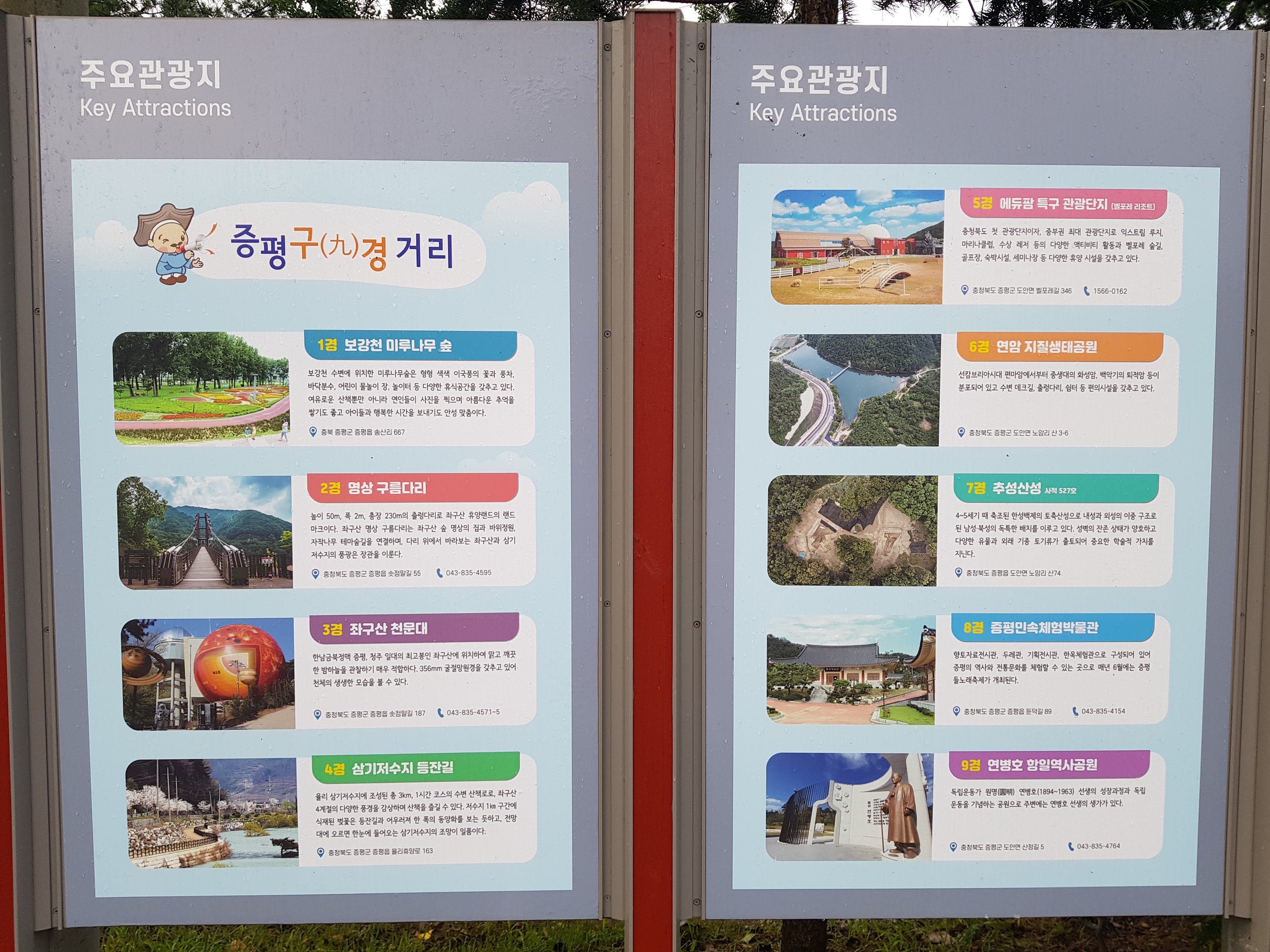 9가지 관광거리를 소개해 놓은 것으로 [보강천 미루나무숲 / 명상 구름다리 / 좌구산 천문대 / 상기저수지 등잔길 / 에듀팜 관광단지 / 지질생태공원 / 추성산성 / 민속체험박물관 / 항일역사공원]이 적혀 있었다. 이 중에서는 몇 번씩 가본곳도 있고 아직 한번도 가보지 못 한 곳도 있다.