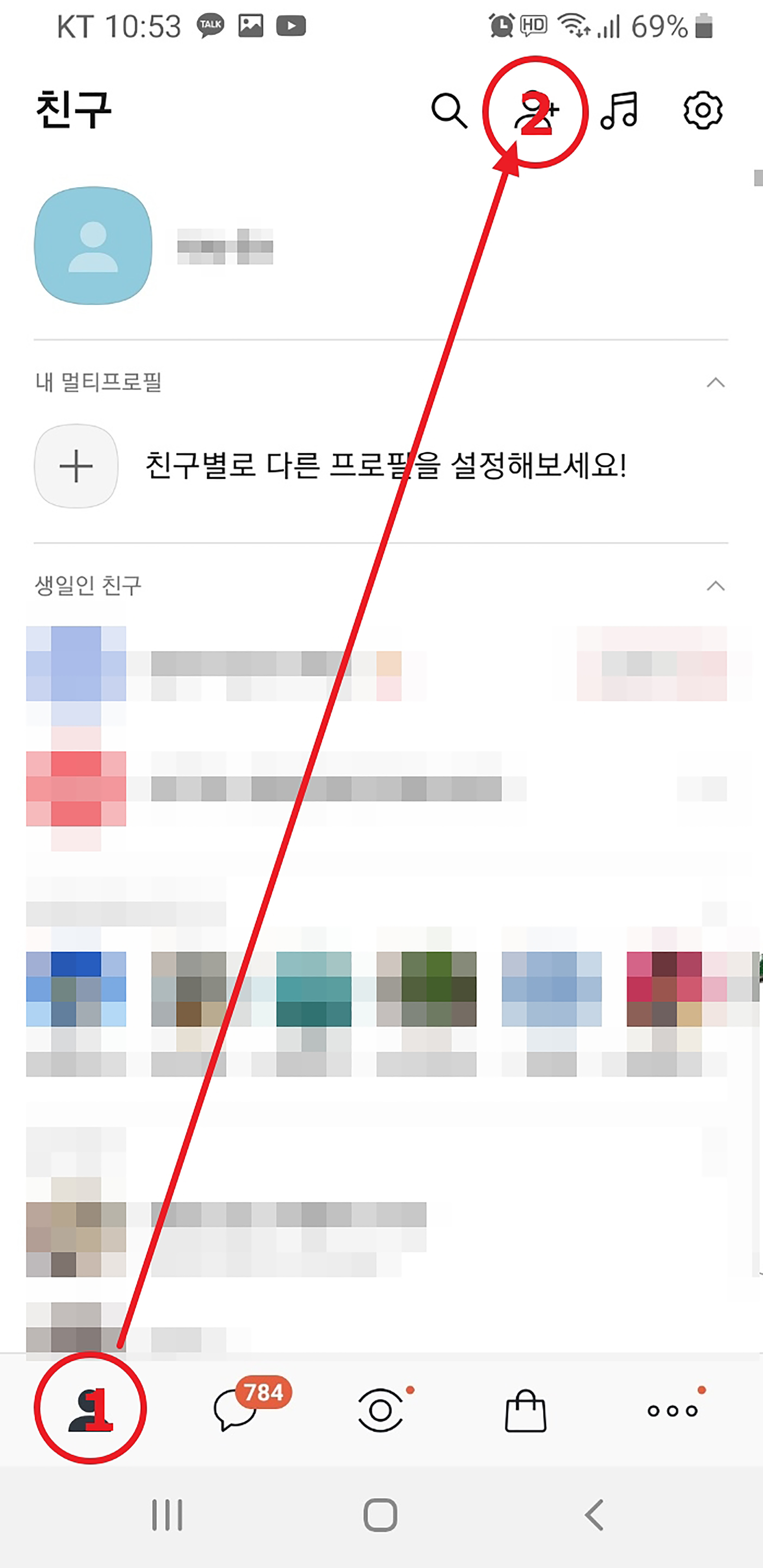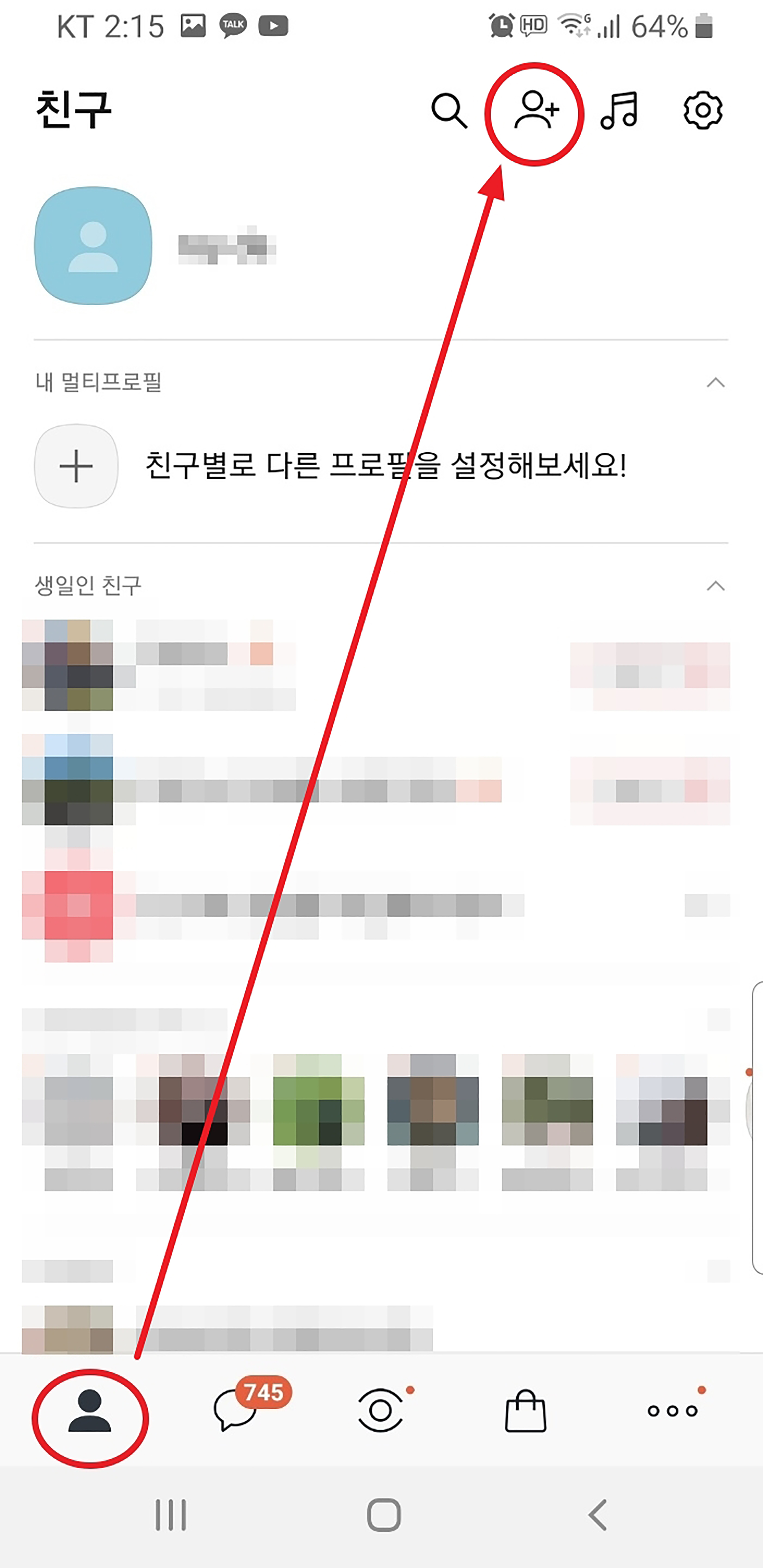 앞서 새친구 ID로 등록할때와 동일한 방법이다. 먼저 친구 목록으로 들어간 다음 위에서 사람모양에 + 가 있는 '친구추가'를 터치해서 들어간다.