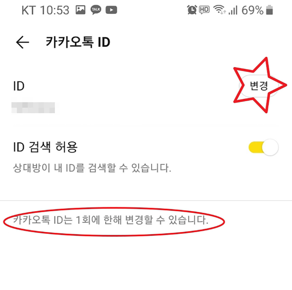 필자도 몰랐던 사실인데 카카오톡에 등록된 ID(아이디)를 1회에 한해서 변경 할 수 있다. 변경하는 방법은 위 4번에서 ID가 보이는 화면에서 ID 오른쪽에 '변경' 을 터치하면 할 수 있다. 모르면 헤메고 알아두면 언젠가 쓸때 편리할 것 같다.