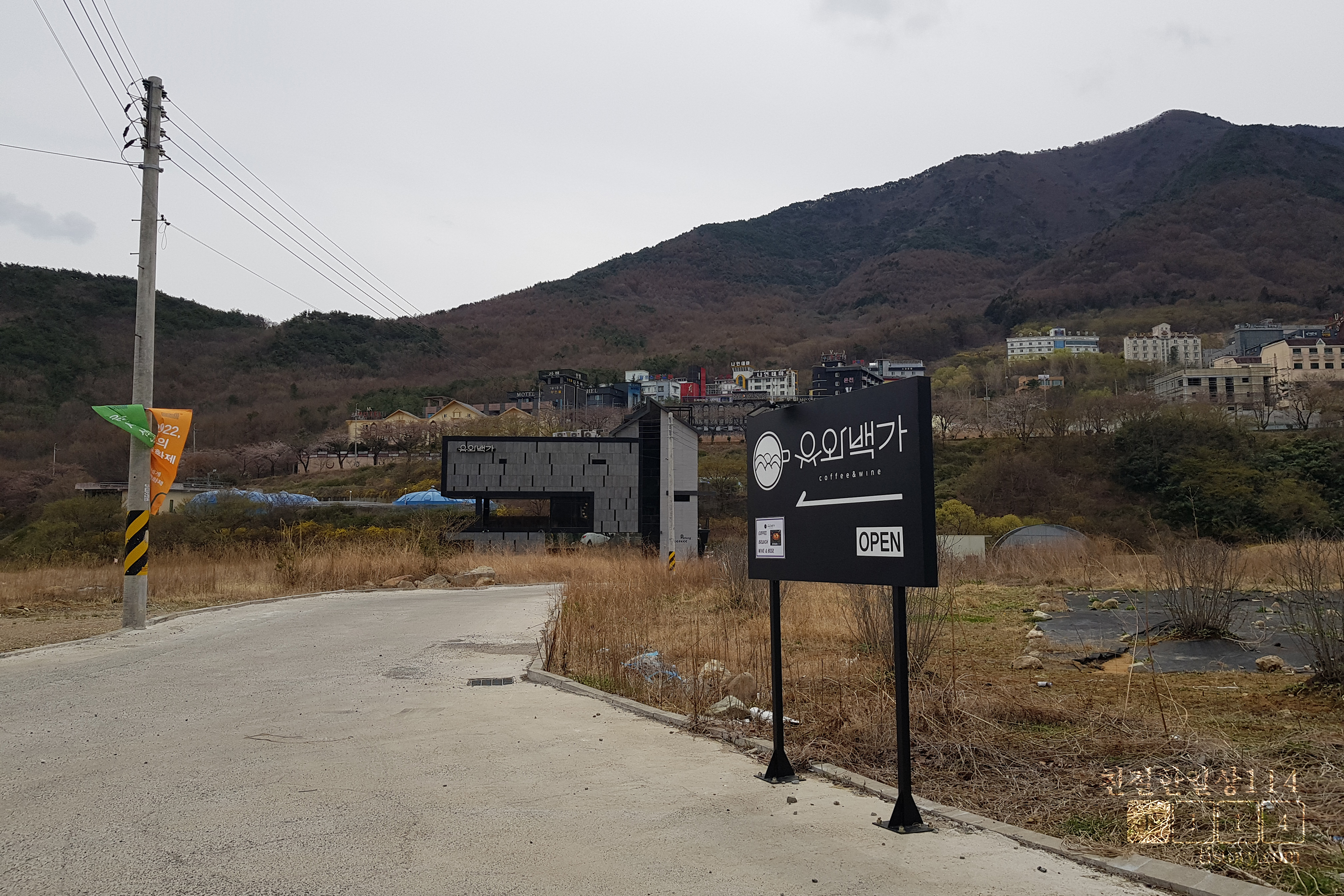 작천정 벚꽃길을 지나 산쪽 방향으로 등억알프스로를 차로 조금만 올라가면 도로쪽에 유와백가 입간판이 보인다.