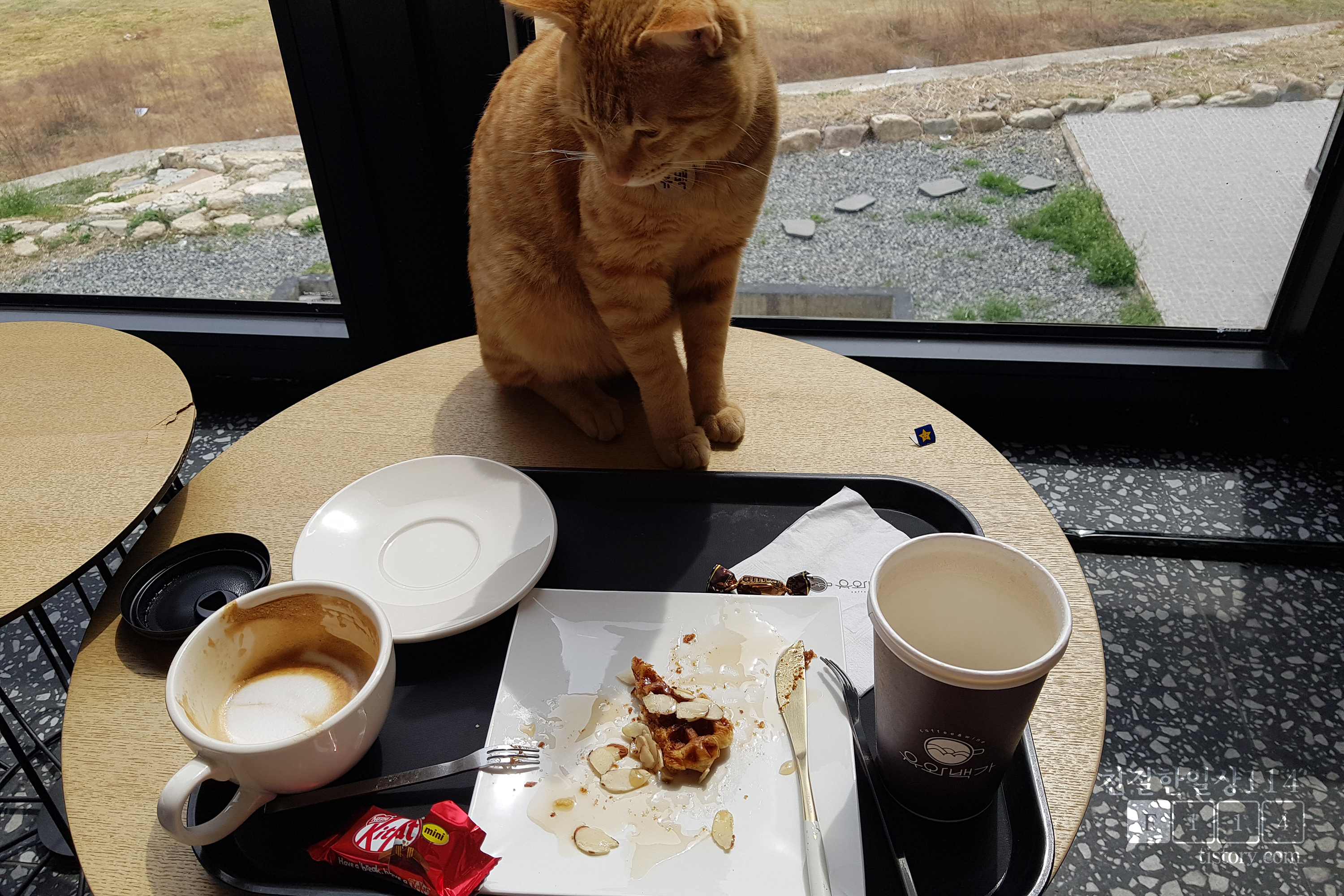 주문한 커피와 크로플이 나오고 멋진 뷰를 감상하며 먹는다. 여유롭게 커피를 마시는데 1층에서 보이던 고양이가 어느새 근처로 와있다.