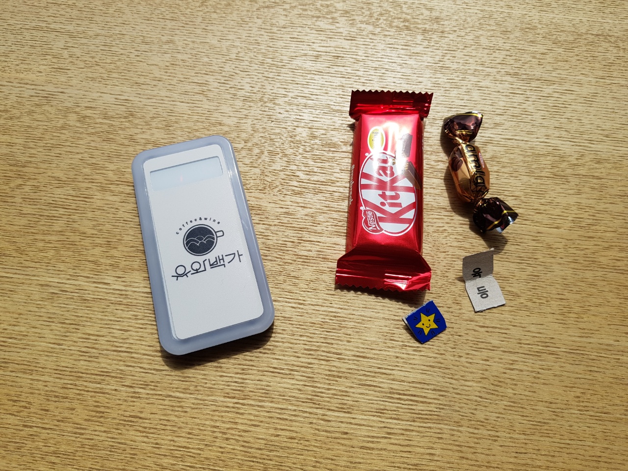 뽑기의 결과 필자는 7등으로 꽝이지만 참가상으로 사탕을, 아내는 6등으로 키켓을 선물로 받았다.