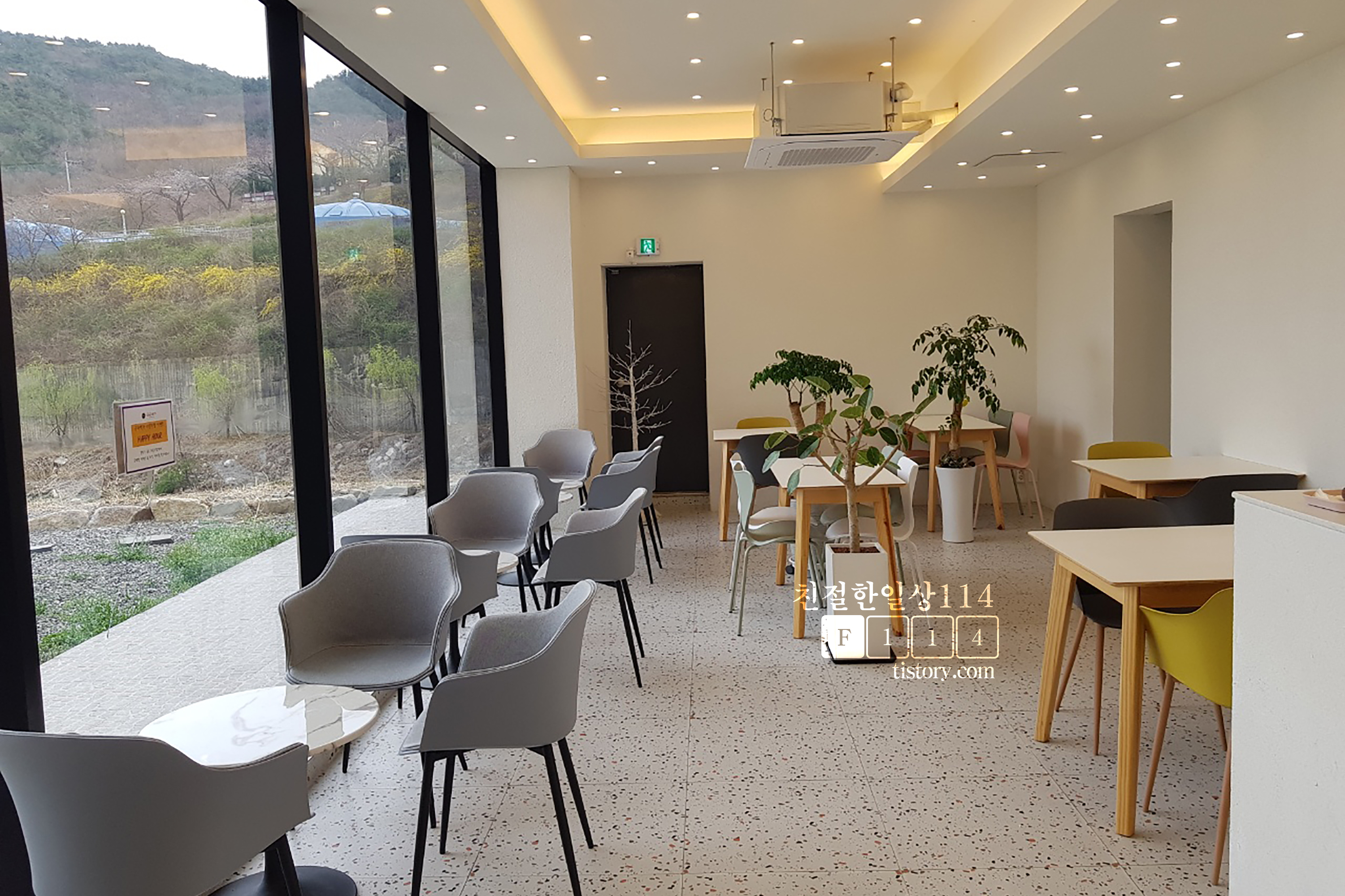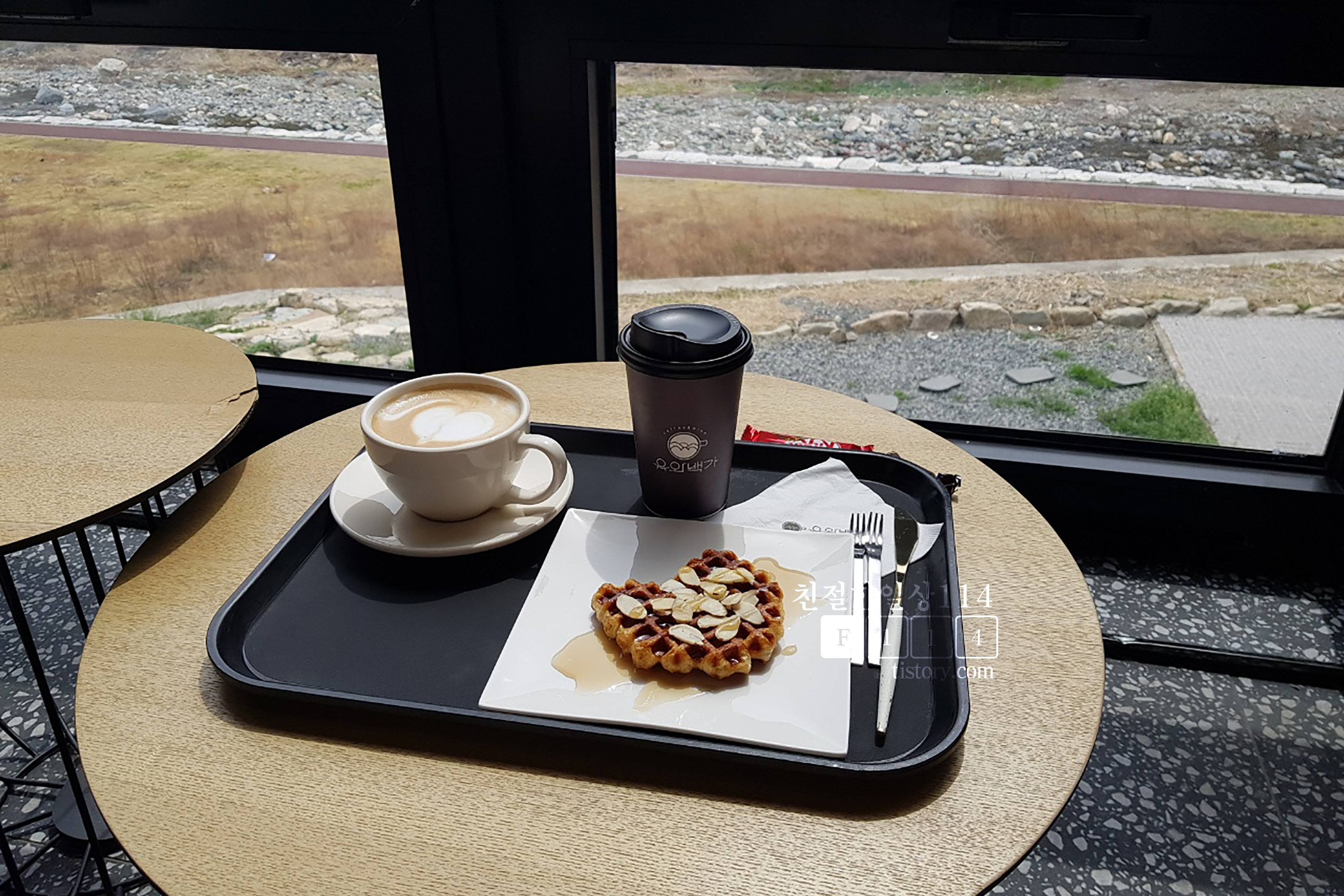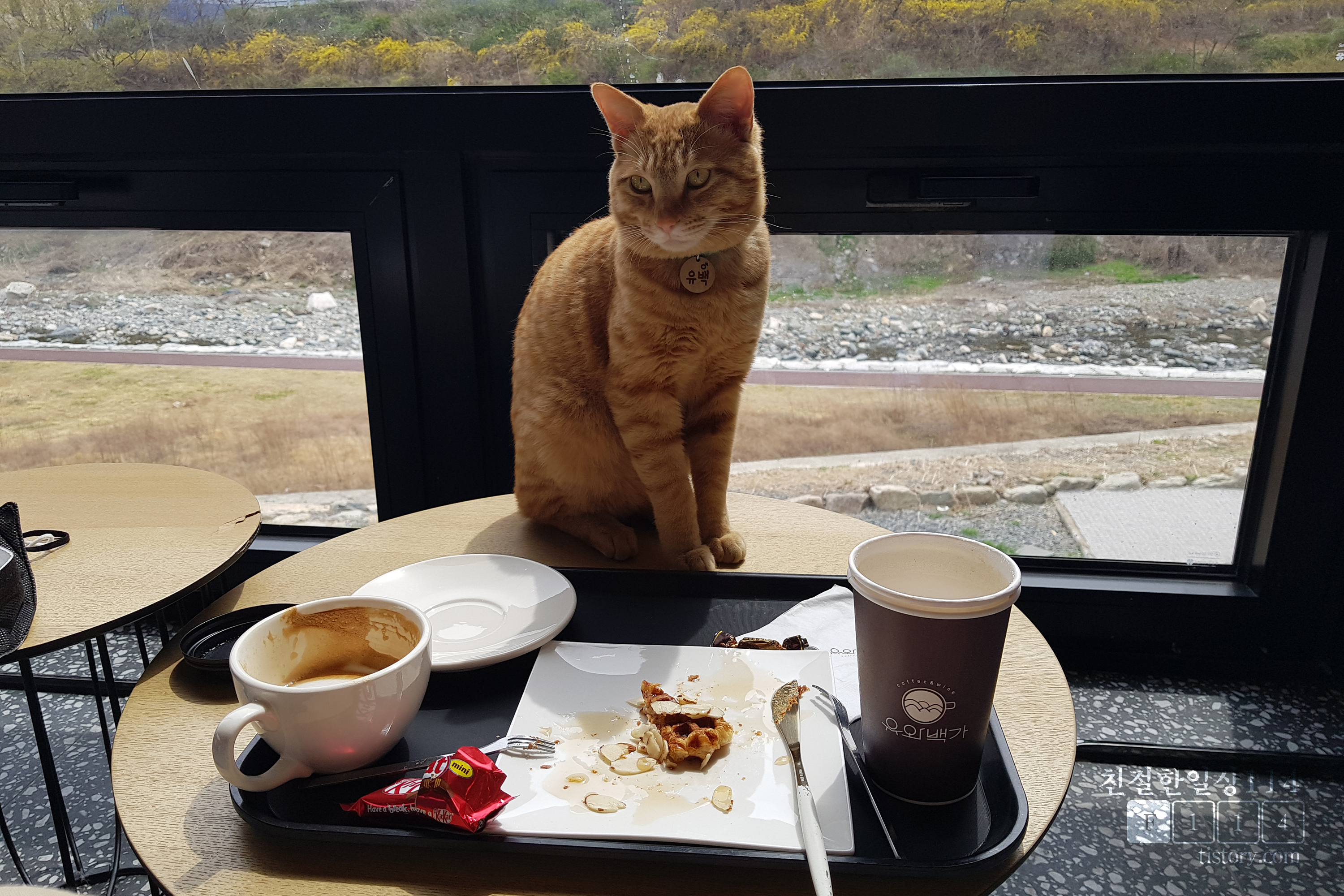 모던한 인테리어와 분위기가 좋았으며 특히 탁트인 산과 천의 전망이 매우 좋았다. 그리고 추억의 뽑기 이벤트와 고양이 유백이의 손님맞이는 색다른 즐거움과 추억을 만들어 주었다. 딸아이가 좋아할 만한 뽑기와 고양이가 있어서 재방문해볼 생각이다.