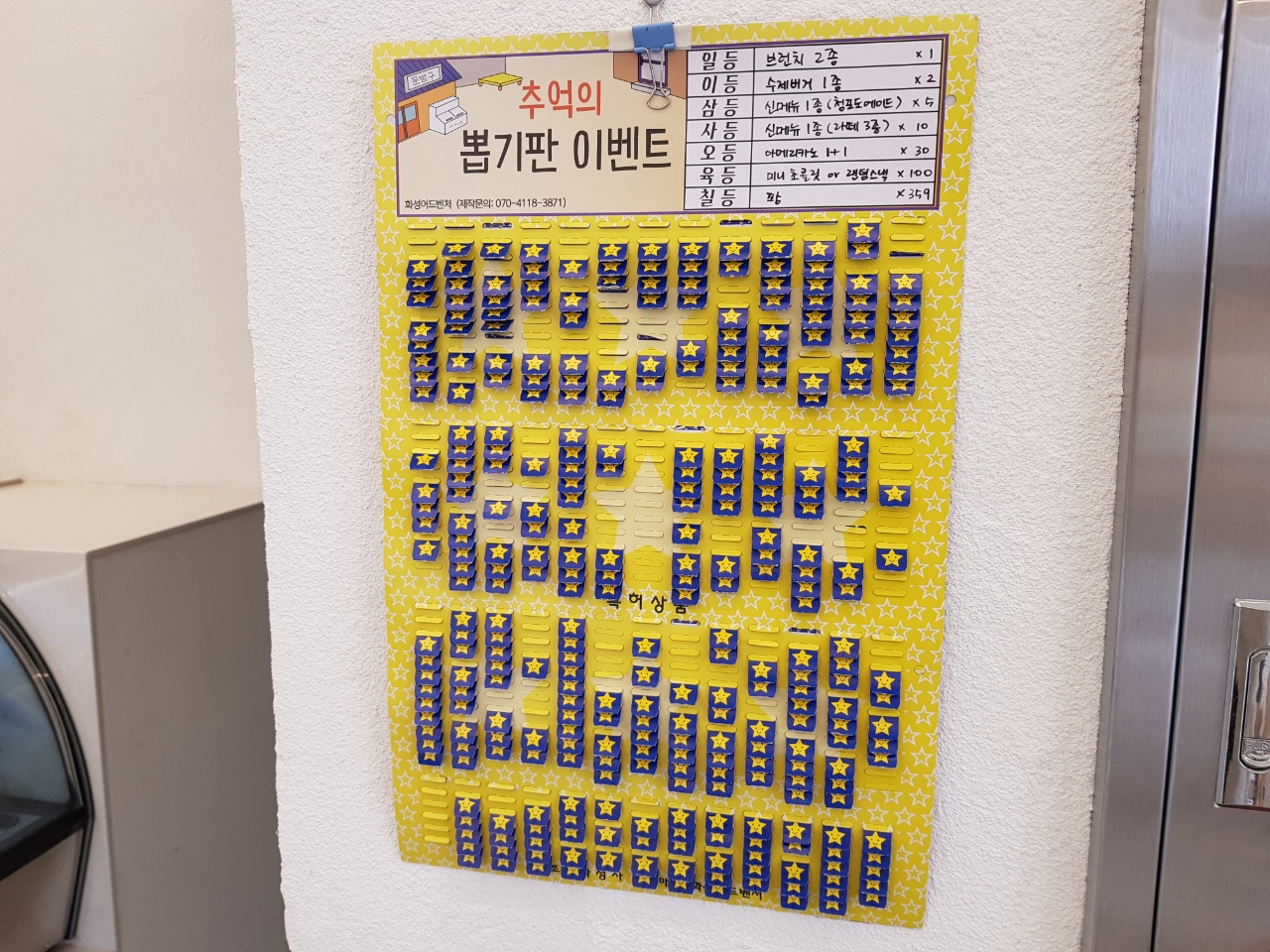 주문을 하고나니 이벤트라면 추억의 뽑기판에서 한장씩 뽑으라고 하신다. 어릴때 학교앞 문방구에서 하던 뽑기다.