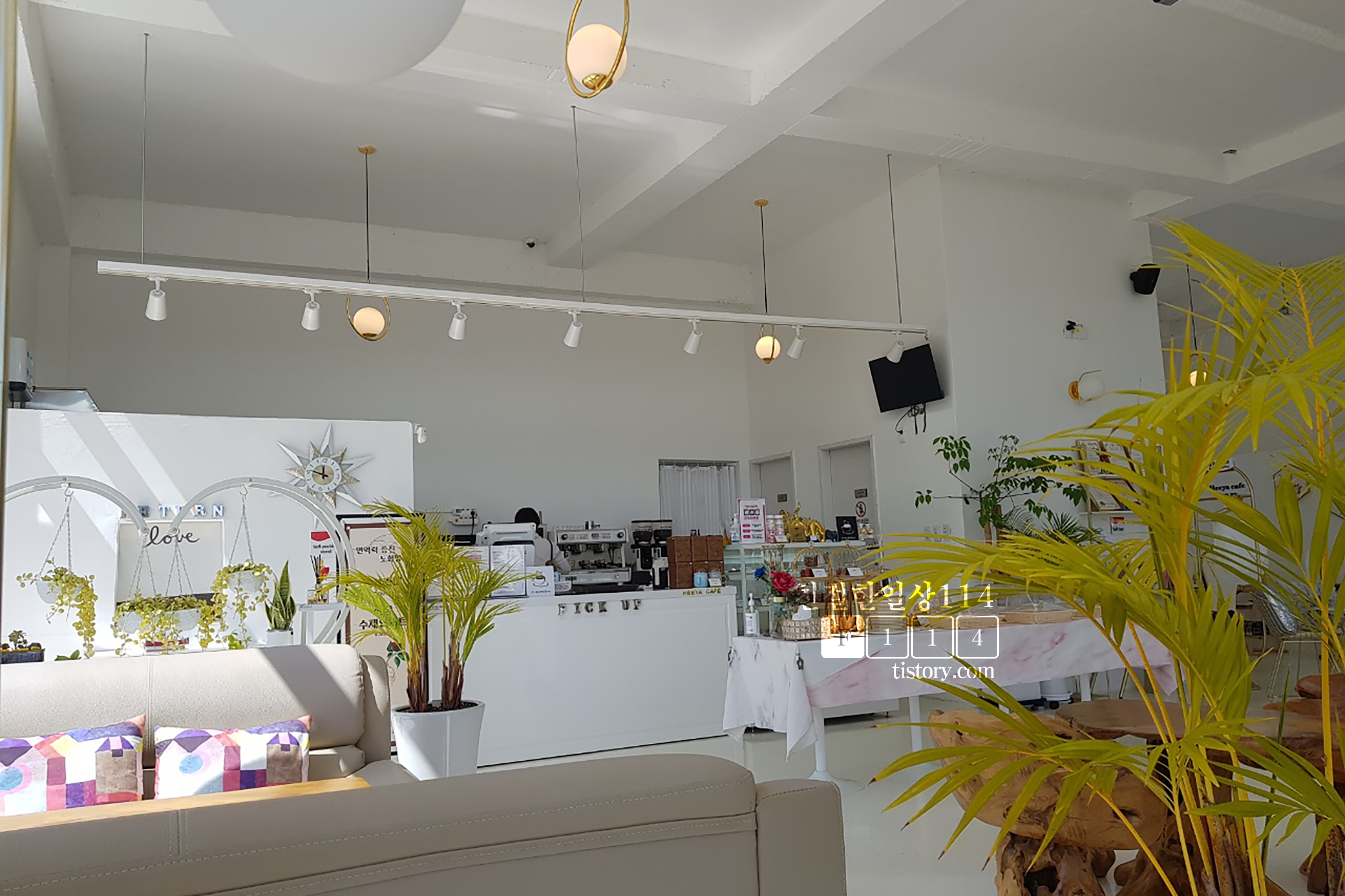 입구에 들어와 전면에 보이는 카운터도 백색으로 칠해져 있고 곳곳에 놓인 화분들이 심심하지 않고 싱그러운 분위기를 살려준다.