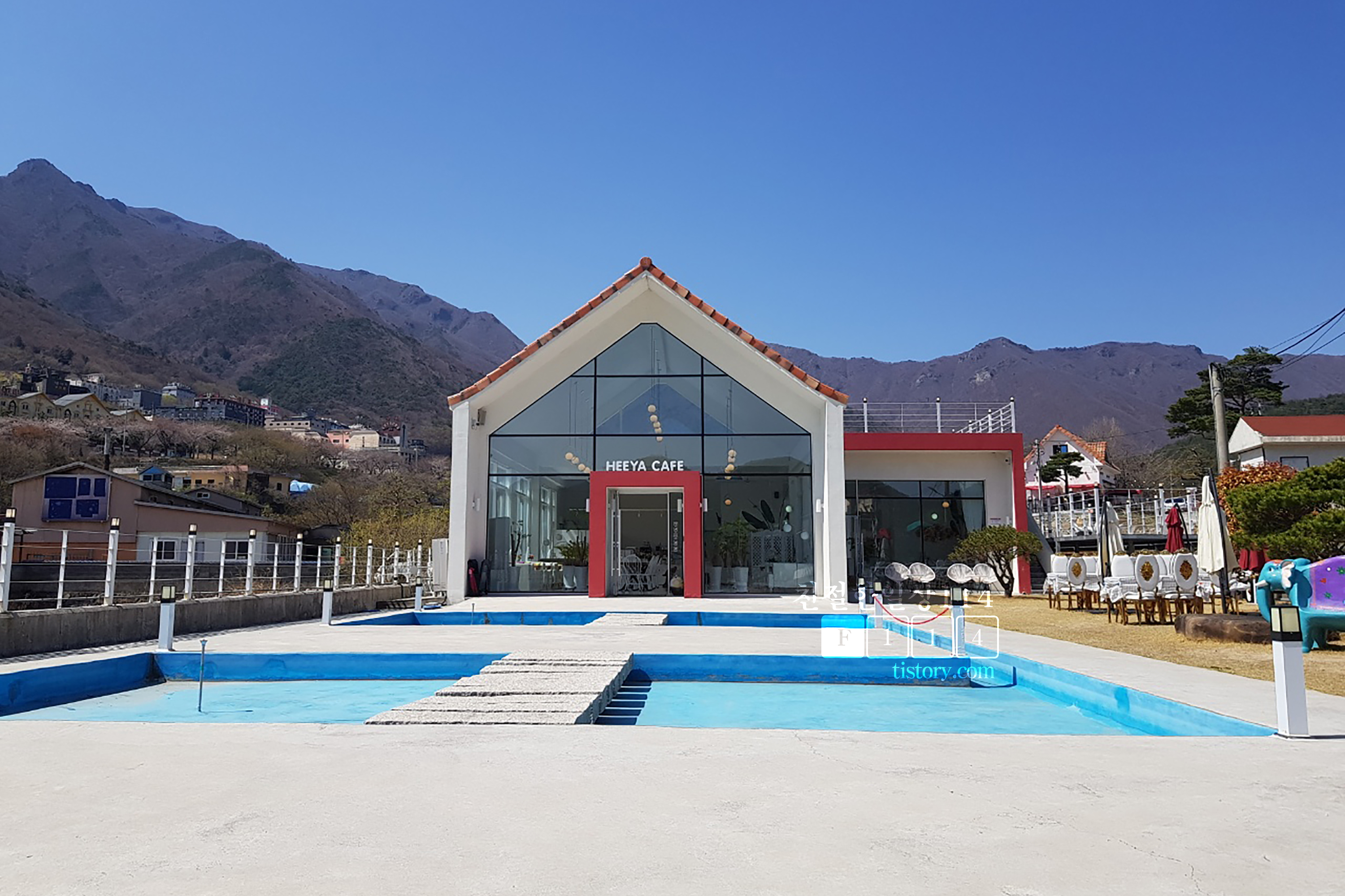 도로에서 카페 히야 입간판이 보이는 쪽으로 들어가면 HEEYA 카페가 나온다. 안쪽으로 자갈이 깔린 드넓은 주차장이 나온다. 20여대 정도는 너끈히 주차할 수 있는 주차장이다.