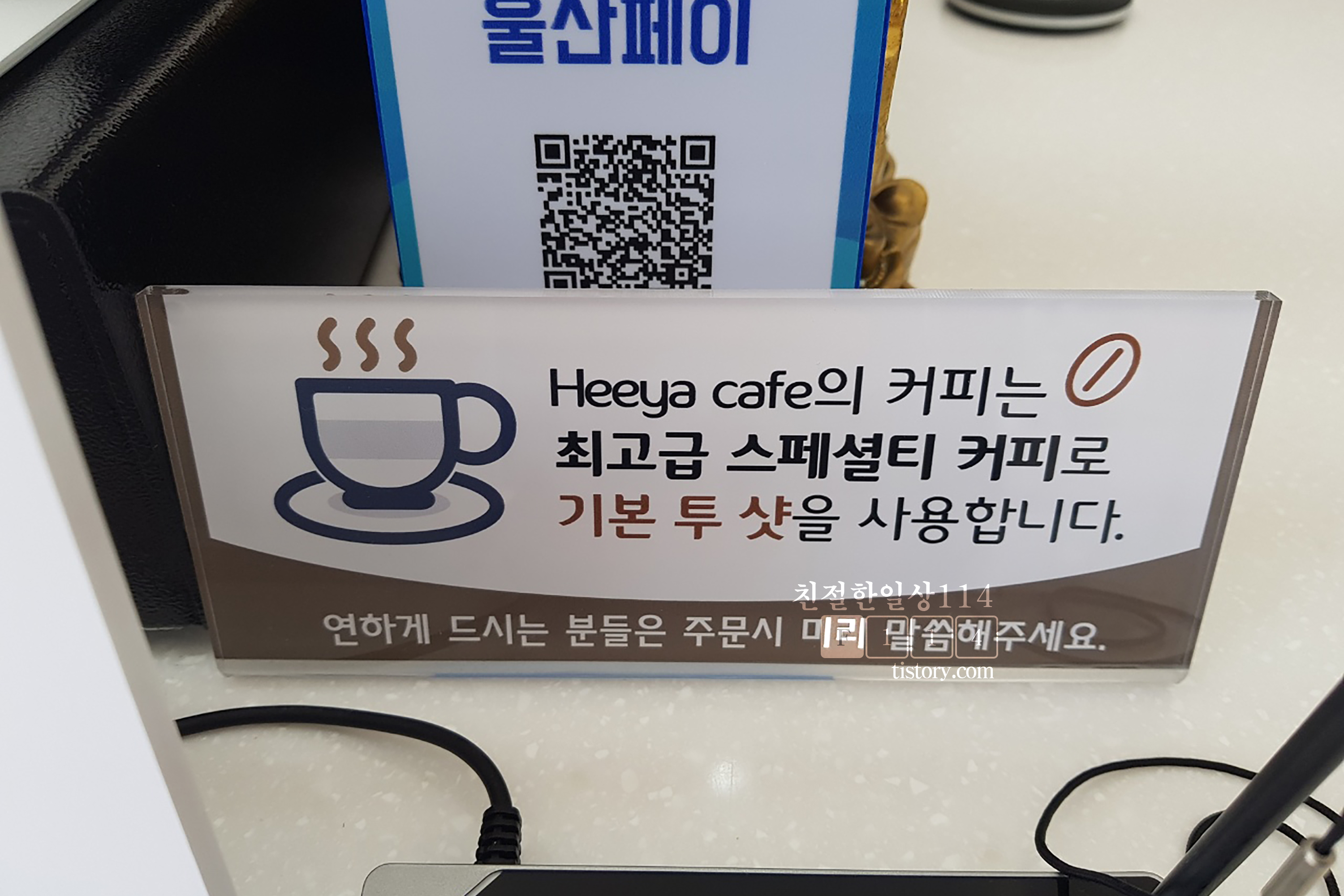 최고급 스페셜티 커피로 제공한다는 안내문. 기본 투 샷으로 나오기때문에 연하게 마시고 싶다면 주문하면서 조절해 달라고 요청해야한다. 이건 주문할때 사장님께서 설명을 주신다. 희야 카페 카운터에 계신 사장님께서 상당히 친절하시다. 주문때 원두 종류 설명과 기본 투샷인데 괜찮을지 여쭤봐 주신다. 그리고 실내 온도는 괜찮은지와 햇볕이 따갑지는 않은지도 신경써 주신다.