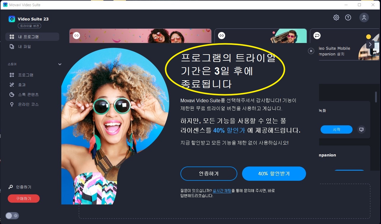 참고로 movavi 무료 버젼인 평가판(체험판)은 7일간만 사용할 수 있다. movavid 의 영상에 찍히는 큼직한 워터마크가 상관없다면 7일간의 체험판 기간이 끝나고 삭제 후 다시 다운로드 받아서 재설치하면 7일 더 사용할 수 있다.