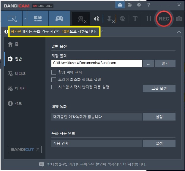 필자는 10분 이내 짤막하게 화면을 녹화할 것이라 상관이 없지만 긴 영상을 녹화하고자 할때는 반디캠이 아닌 다른 프로그램을 사용하거나 정품을 구매해야 한다.