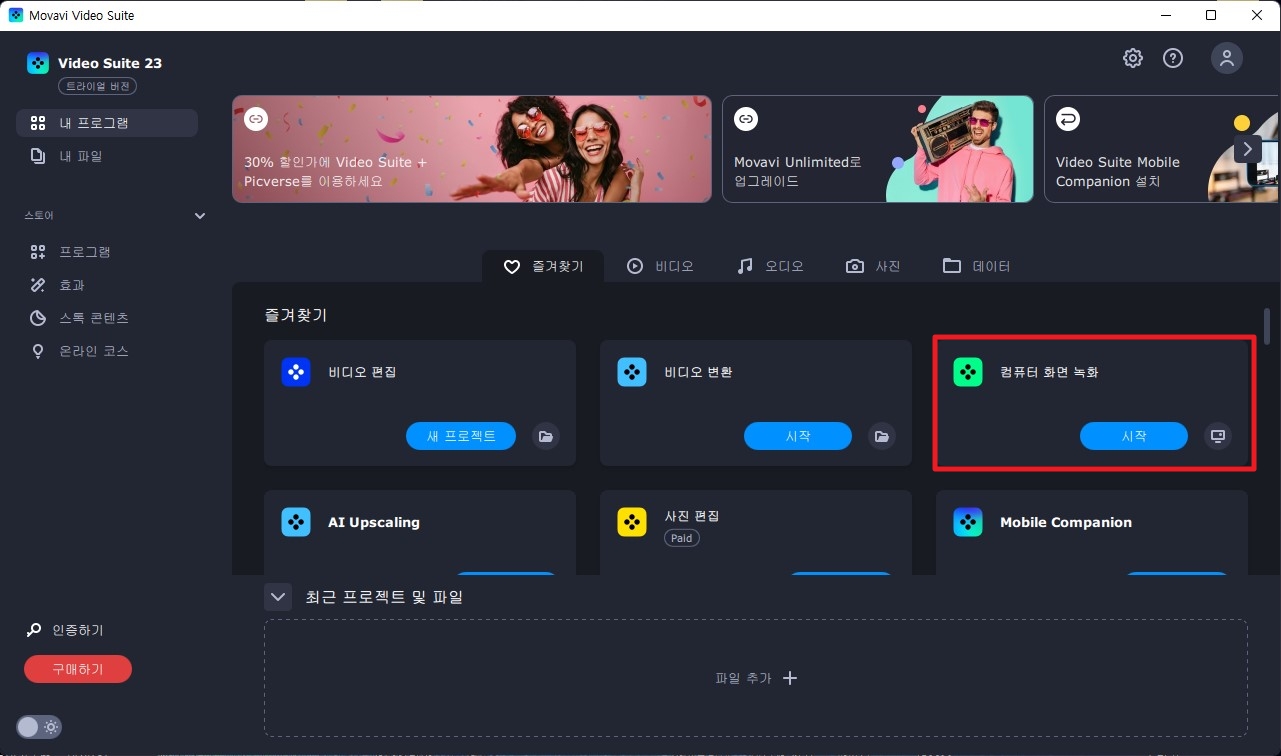 설치 후 movavi를 실행한 화면으로 비디오 편집/비디오 변환/사진편집/컴퓨터 화면 녹화 등 여러 기능이 있다.