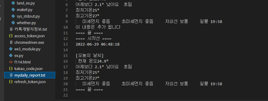 가장 먼저 상단에 import로 sys 불러오기를 해준다. 그리고 sys.stdout = open('mydaily_report.txt   ','a', encoding="utf8") 한줄 넣어주면 print()로 출력되는 함수 결과 값을 text 파일 형식으로 저장할 수 있다. 주황색으로 표시해둔 부분은 내용을 추가한다는 것으로 기존의 내용은 그대로 두고 아래에 새로운 내용을 붙여서 파일을 작성하게 된다. 만약 기존 내용이 필요없고 새로운 내용으로만 쓰고 싶다면 'w' 를 써주면 된다.