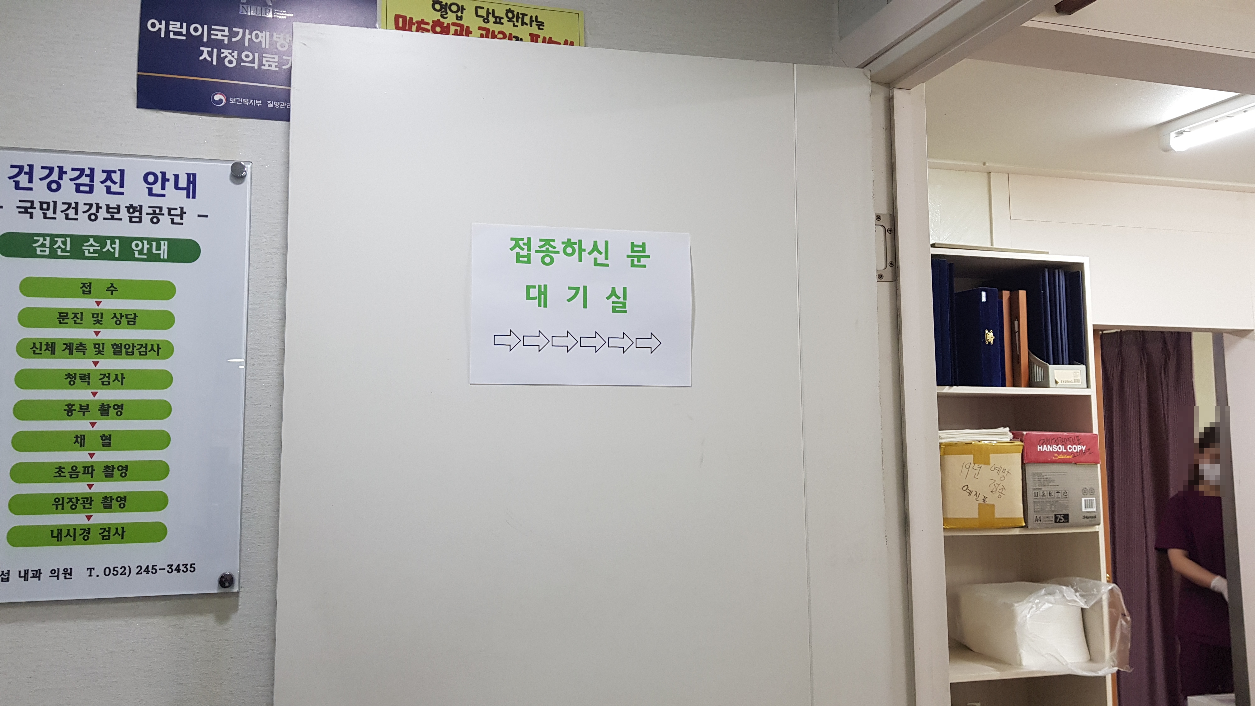 접종 예약자 확인 -> 예방접종 예진표 작성 -> 접종 -> 대기실(15분) -> 귀가