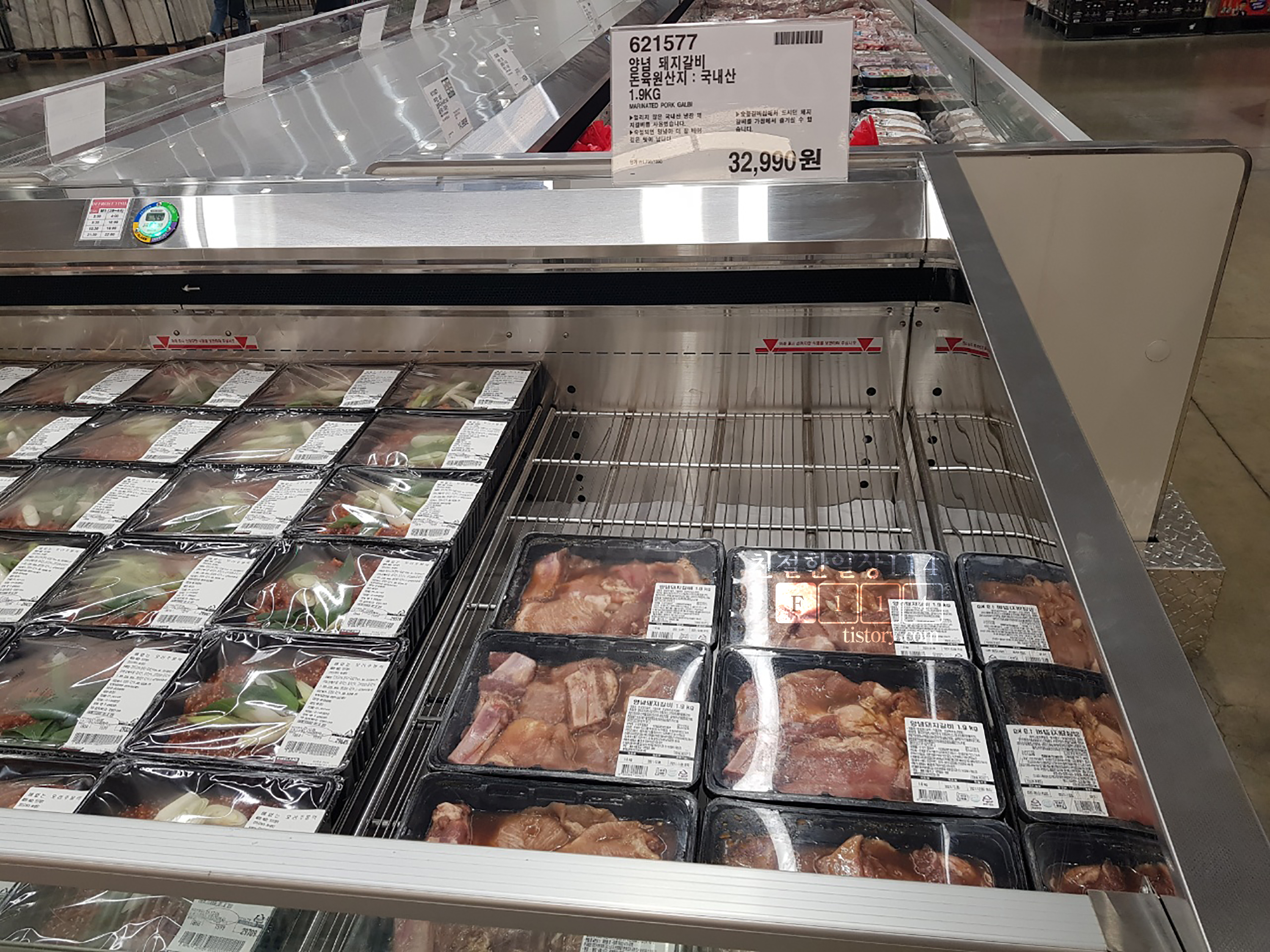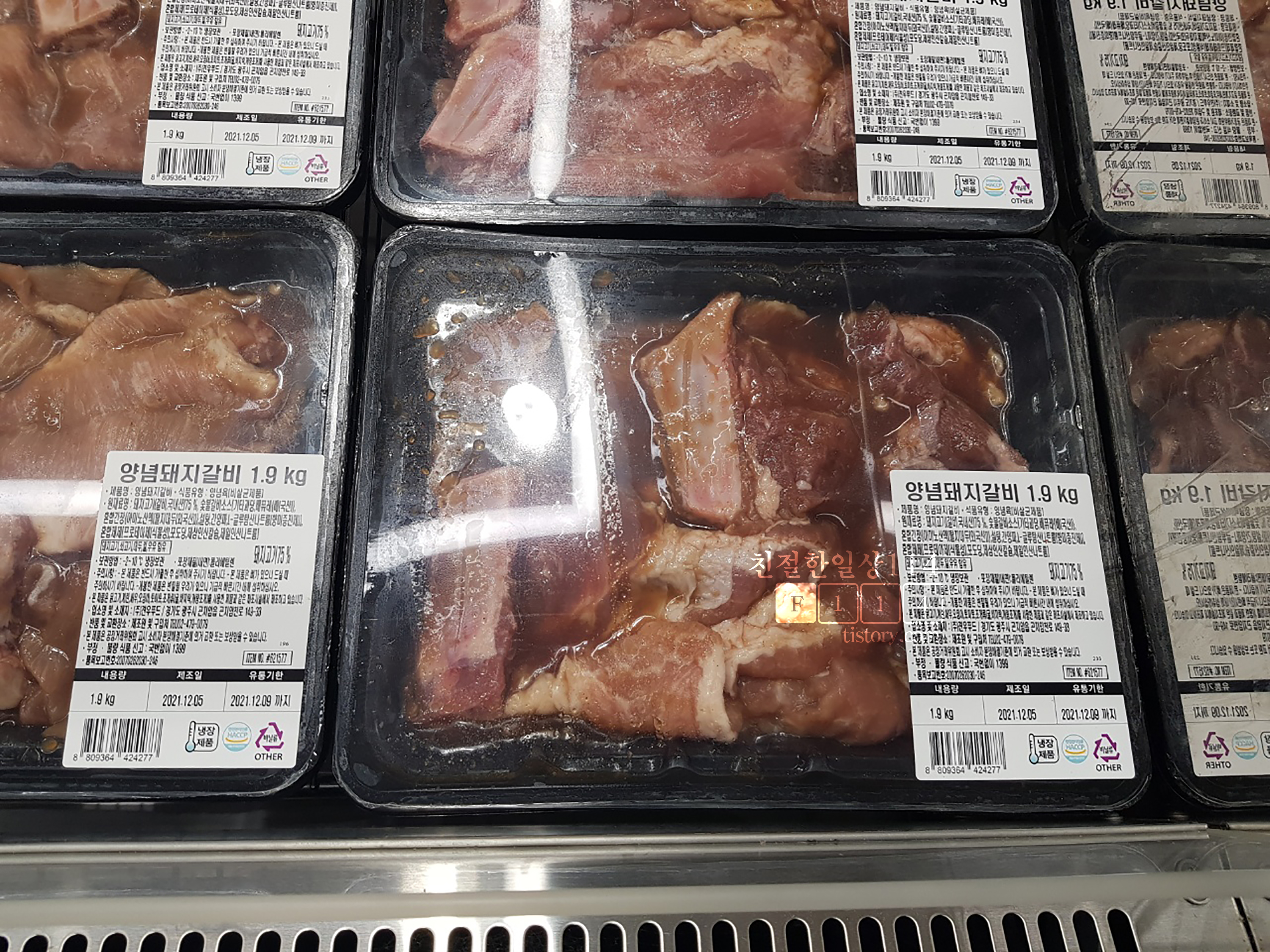 국내산 양념돼지갈비 32,990원, 집에서 떨어지지 않게 관리하고 있는 품목이다. 1.9kg 이라 양이 꽤 된다. 한번 사면 3~4개로 소분해 두고 한번씩 구워먹는다. 처음에는 태우는 부분이 많았는데 이제는 실력이 많이 늘어서 태우는 부분 하나 없이 잘 굽는다.