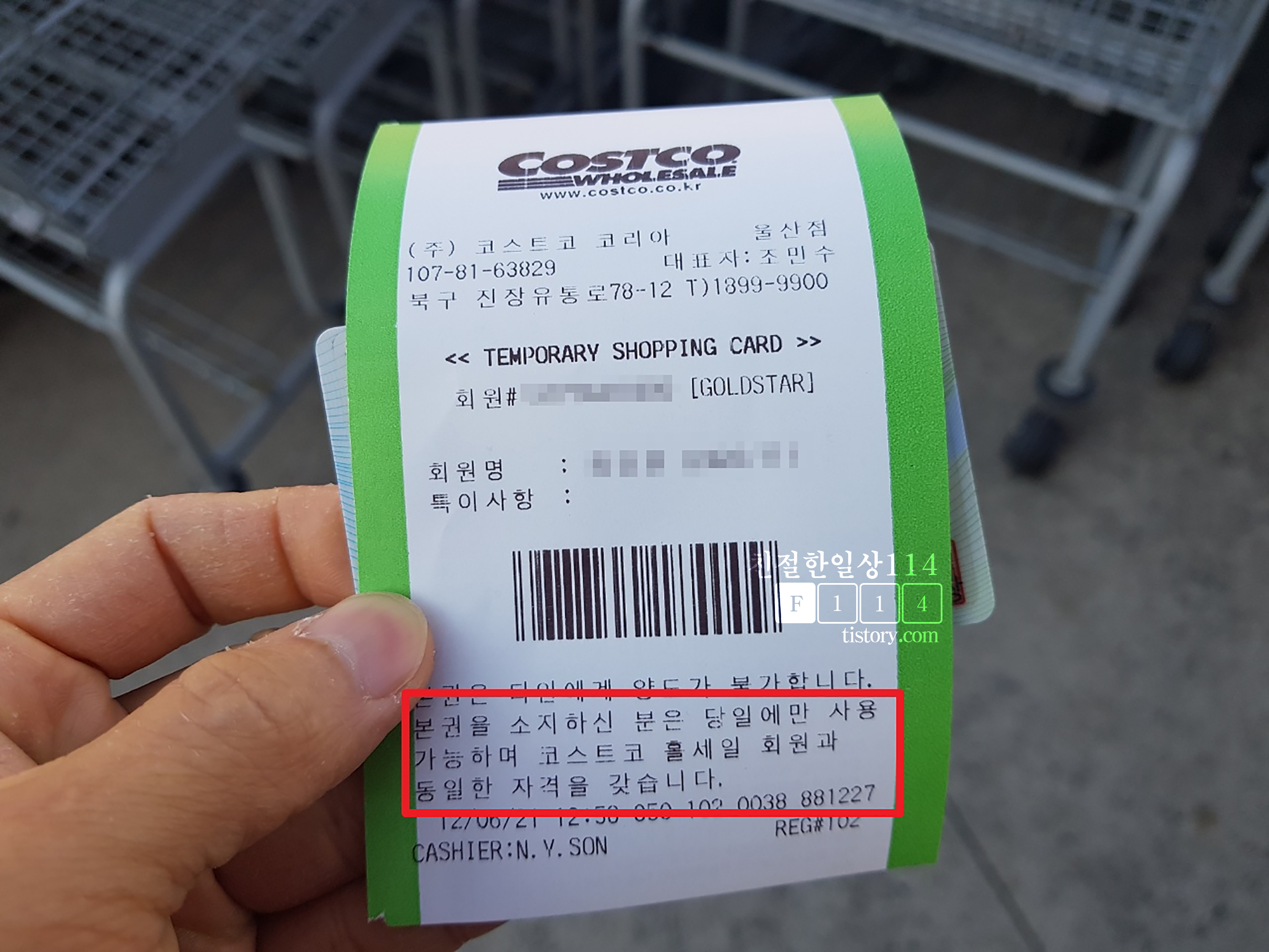 'TEMPORARY SHOPPING CARD' 이라고 프린트된 종이가 발급 됐다. 아래에 '당일에만 사용가능하며 코스트코 회원과 동일한 자격을 갖습니다' 라고 적혀있다. 당일권은 처음 발급받아 봤는데 이렇게 생겼다. 계산할때 회원카드처럼 제시하면 된다. 당일권은 일회용으로 계산 후 다시 돌려주지는 않는다.