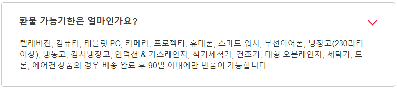 텔레비전, 컴퓨터, 태블릿 PC, 카메라, 프로젝터, 휴대폰, 스마트 워치, 무선이어폰, 냉장고(280리터 이상), 냉동고, 김치냉장고, 인덕션 & 가스레인지, 식기세척기, 건조기, 대형 오븐레인지, 세탁기, 드론, 에어컨 상품의 경우 배송 완료 후 90일 이내에만 반품 가능하다.
