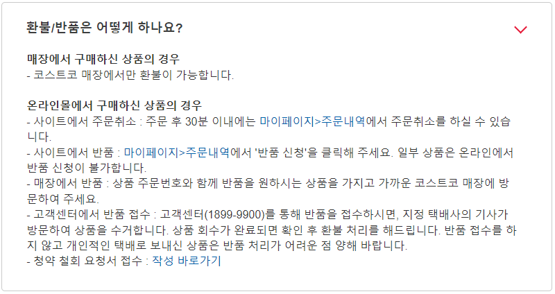 - 매장에서 반품 : 상품 주문번호와 함께 반품 상품을 가지고 가까운 코스트코 매장에 방문.