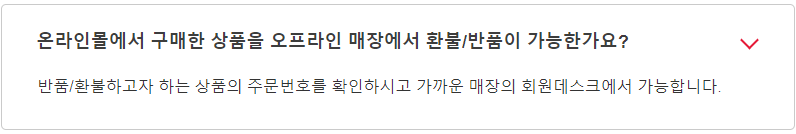 - 사이트에서 반품 : 마이페이지>주문내역에서 '반품 신청'을 클릭. 일부 상품은 온라인에서 반품 신청이 불가.